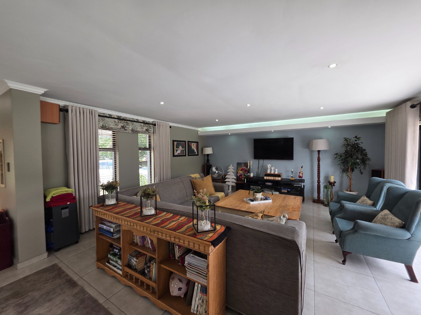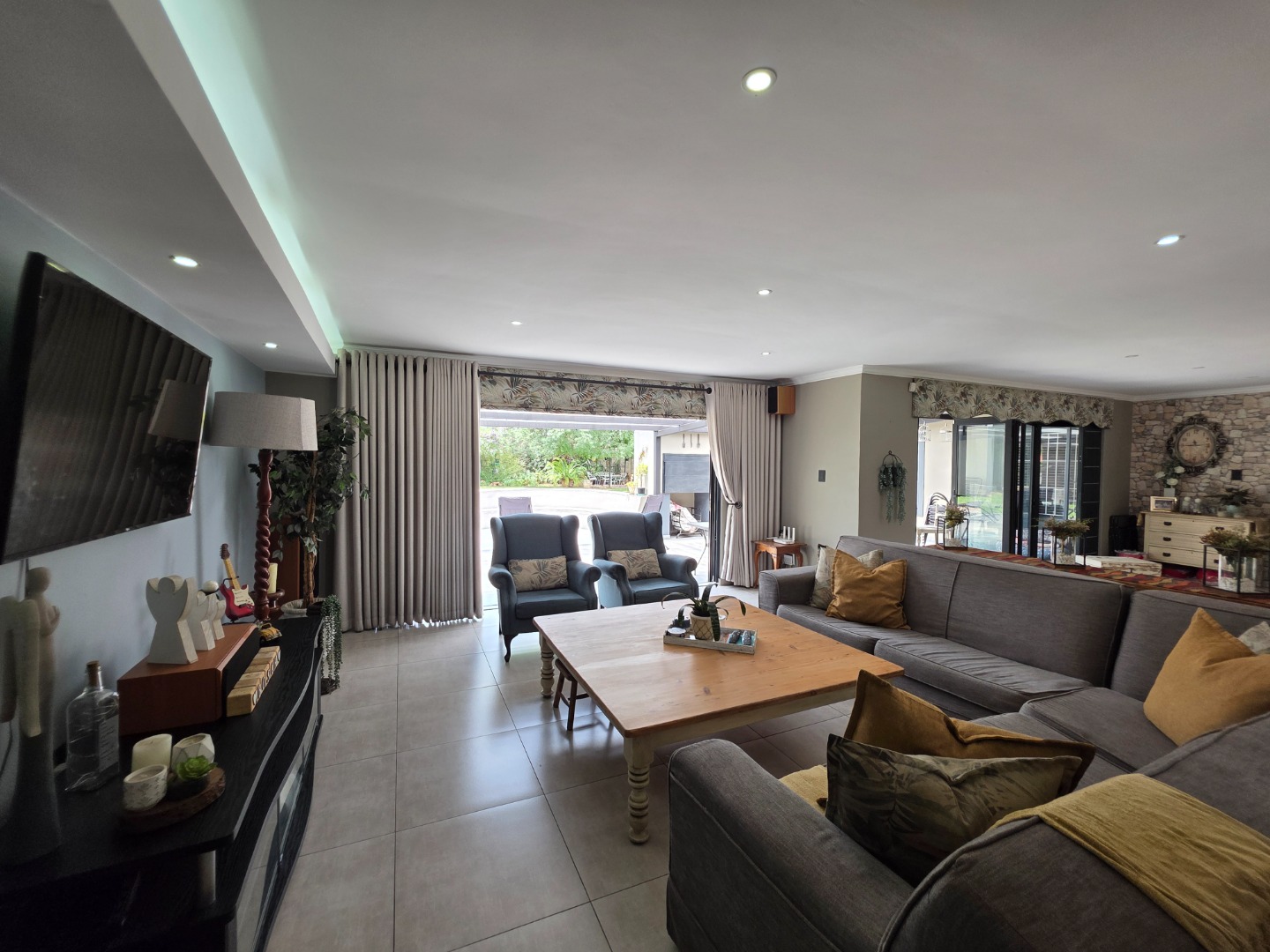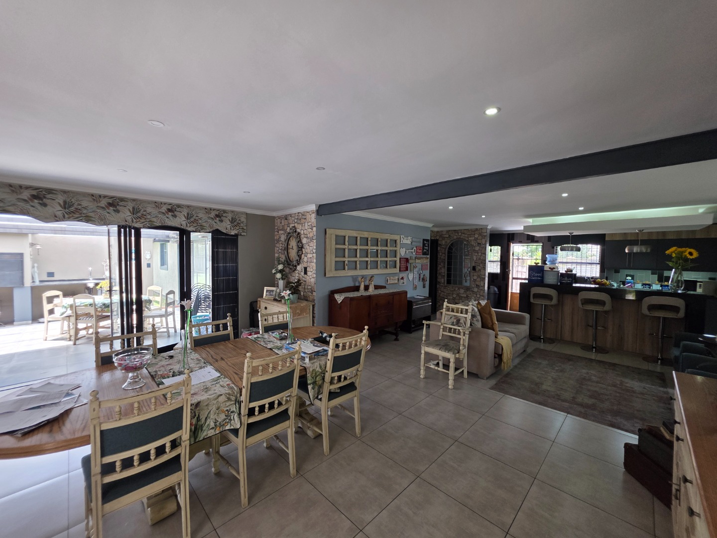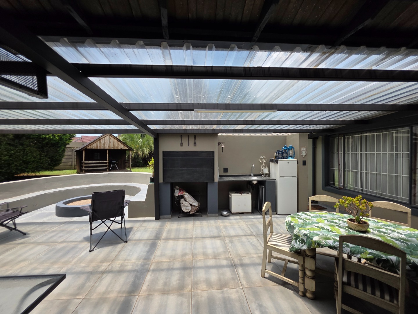 Outdoor living is equally exceptional, with an expansive garden providing a verdant backdrop for relaxation and recreation. A private patio, complete with a built-in braai and an inviting braai room, sets the stage for memorable al fresco gatherings. The property also offers a double garage and three additional parking spaces, catering to all vehicular needs. Pets are warmly welcomed, ensuring a complete family lifestyle.