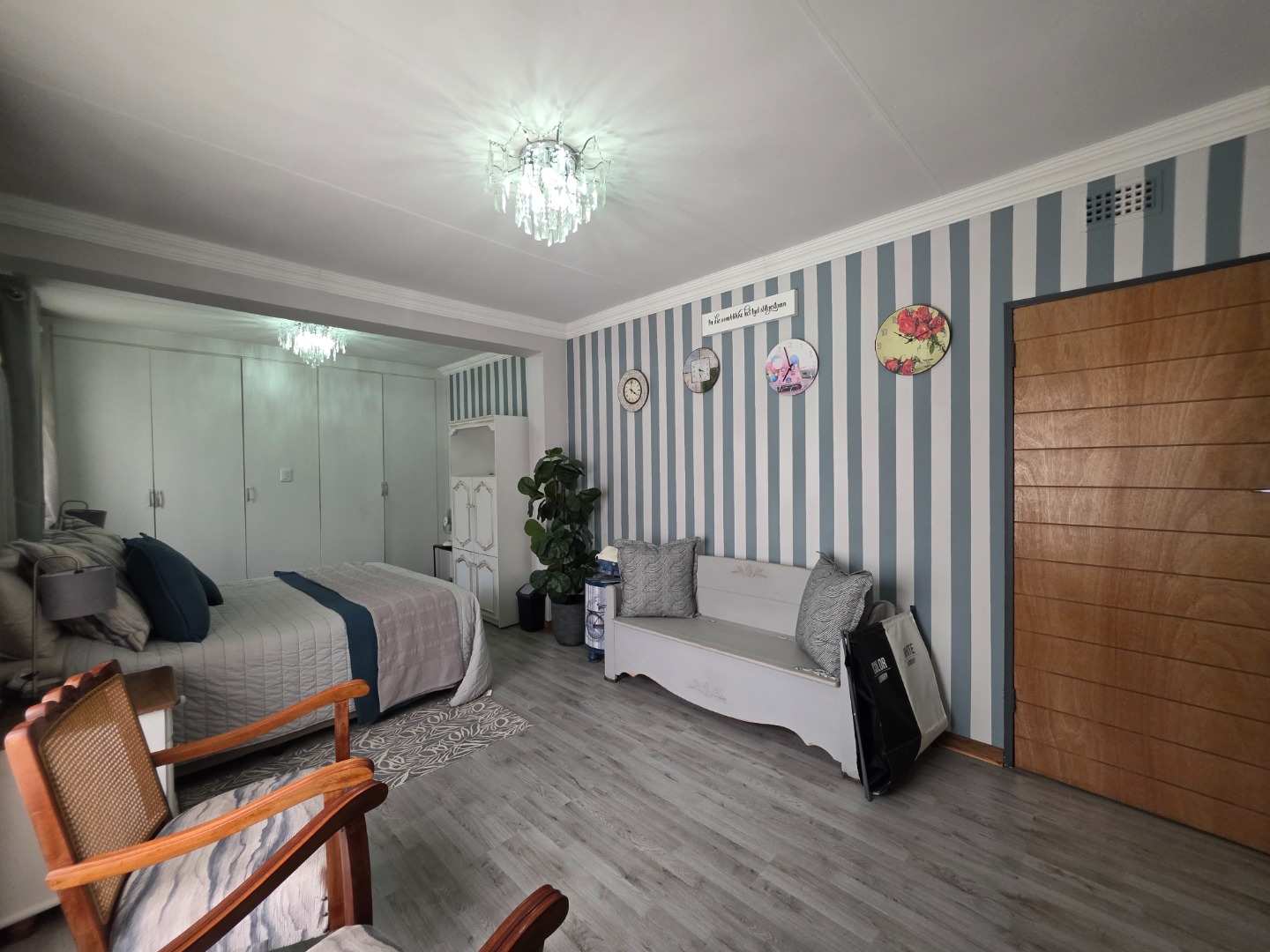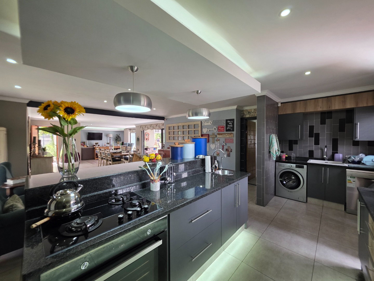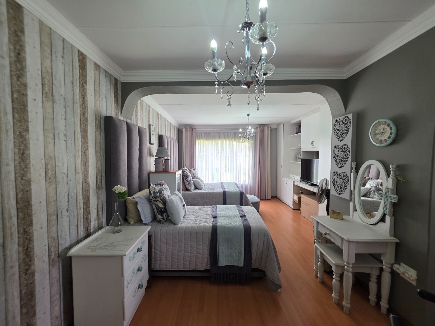 Outdoor living is equally exceptional, with an expansive garden providing a verdant backdrop for relaxation and recreation. A private patio, complete with a built-in braai and an inviting braai room, sets the stage for memorable al fresco gatherings. The property also offers a double garage and three additional parking spaces, catering to all vehicular needs. Pets are warmly welcomed, ensuring a complete family lifestyle.