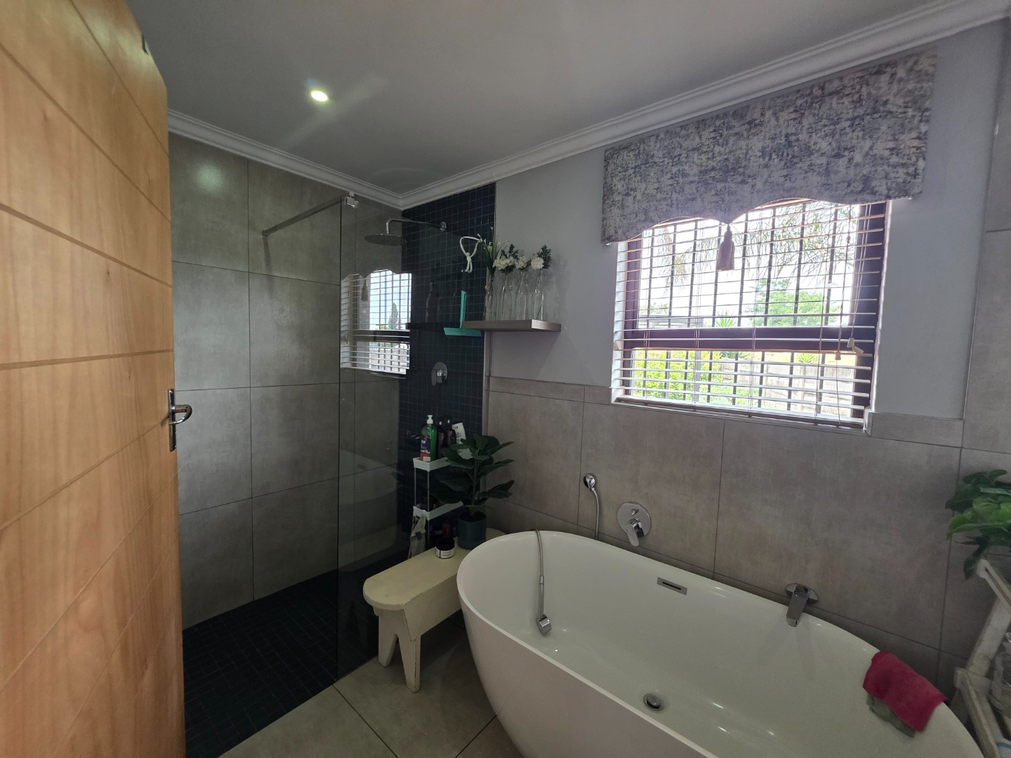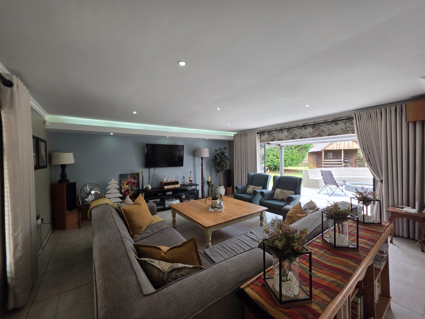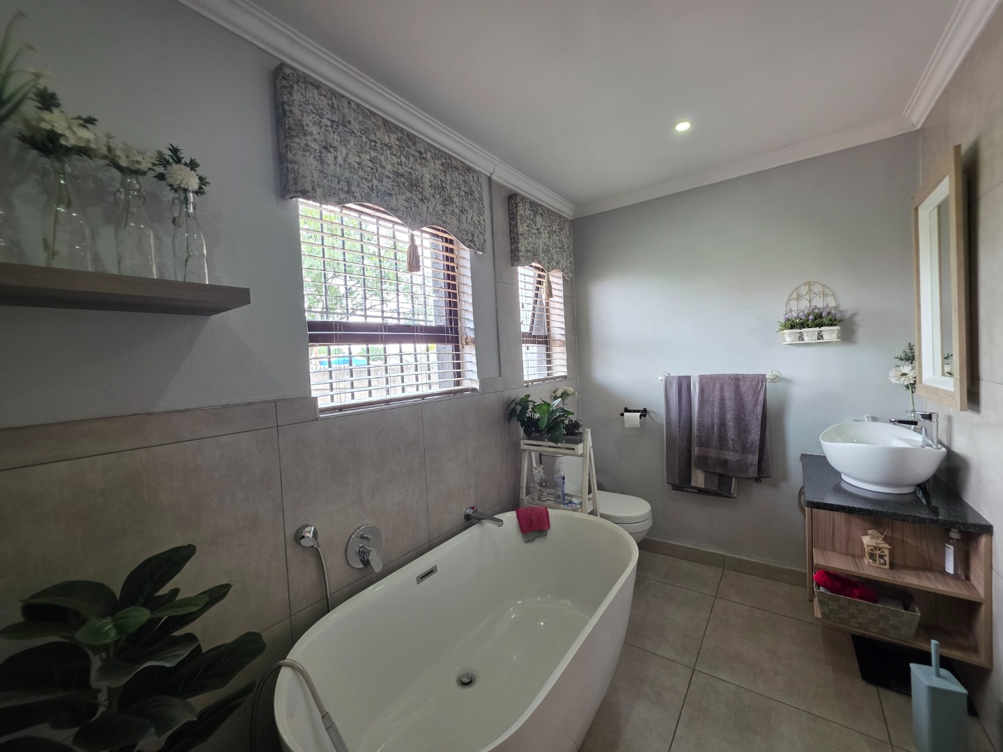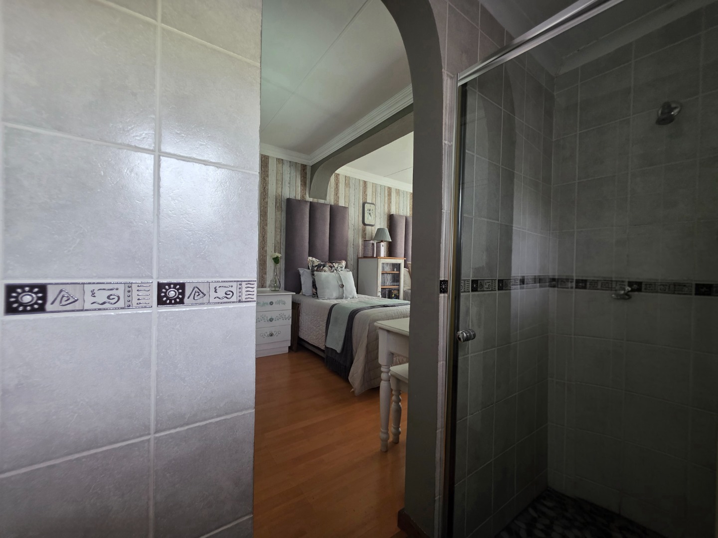 Outdoor living is equally exceptional, with an expansive garden providing a verdant backdrop for relaxation and recreation. A private patio, complete with a built-in braai and an inviting braai room, sets the stage for memorable al fresco gatherings. The property also offers a double garage and three additional parking spaces, catering to all vehicular needs. Pets are warmly welcomed, ensuring a complete family lifestyle.