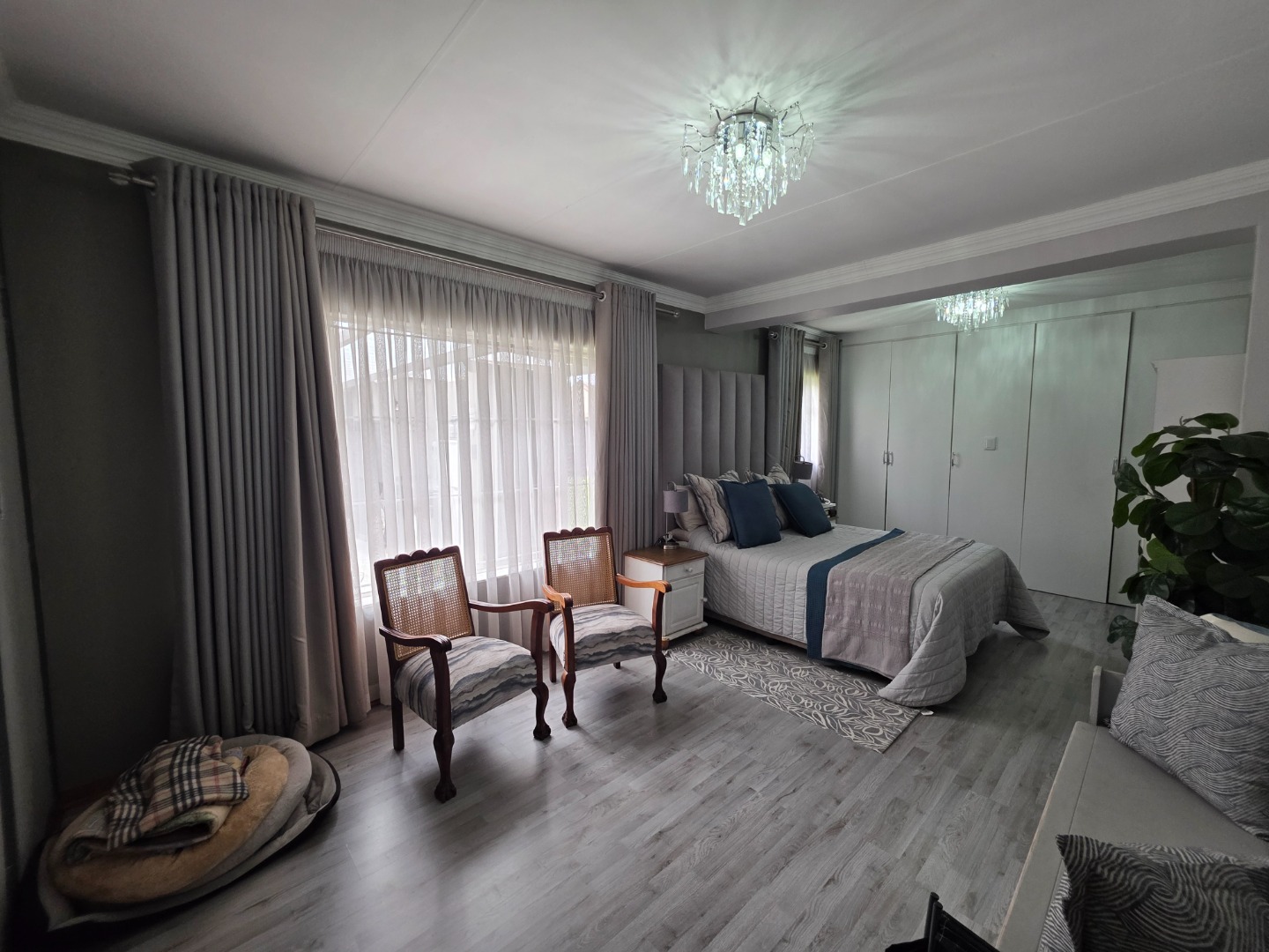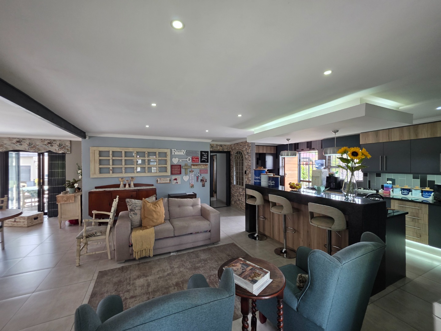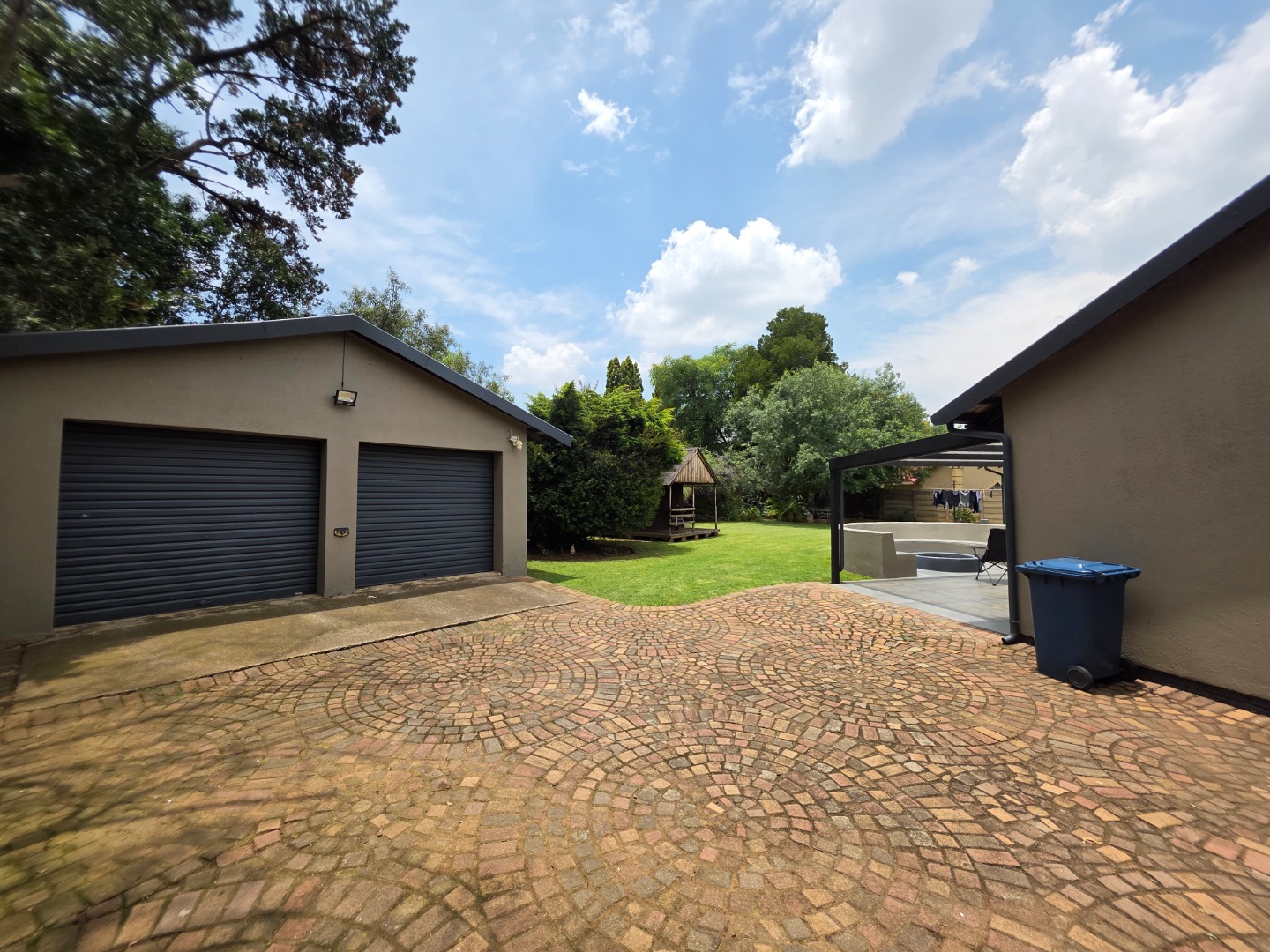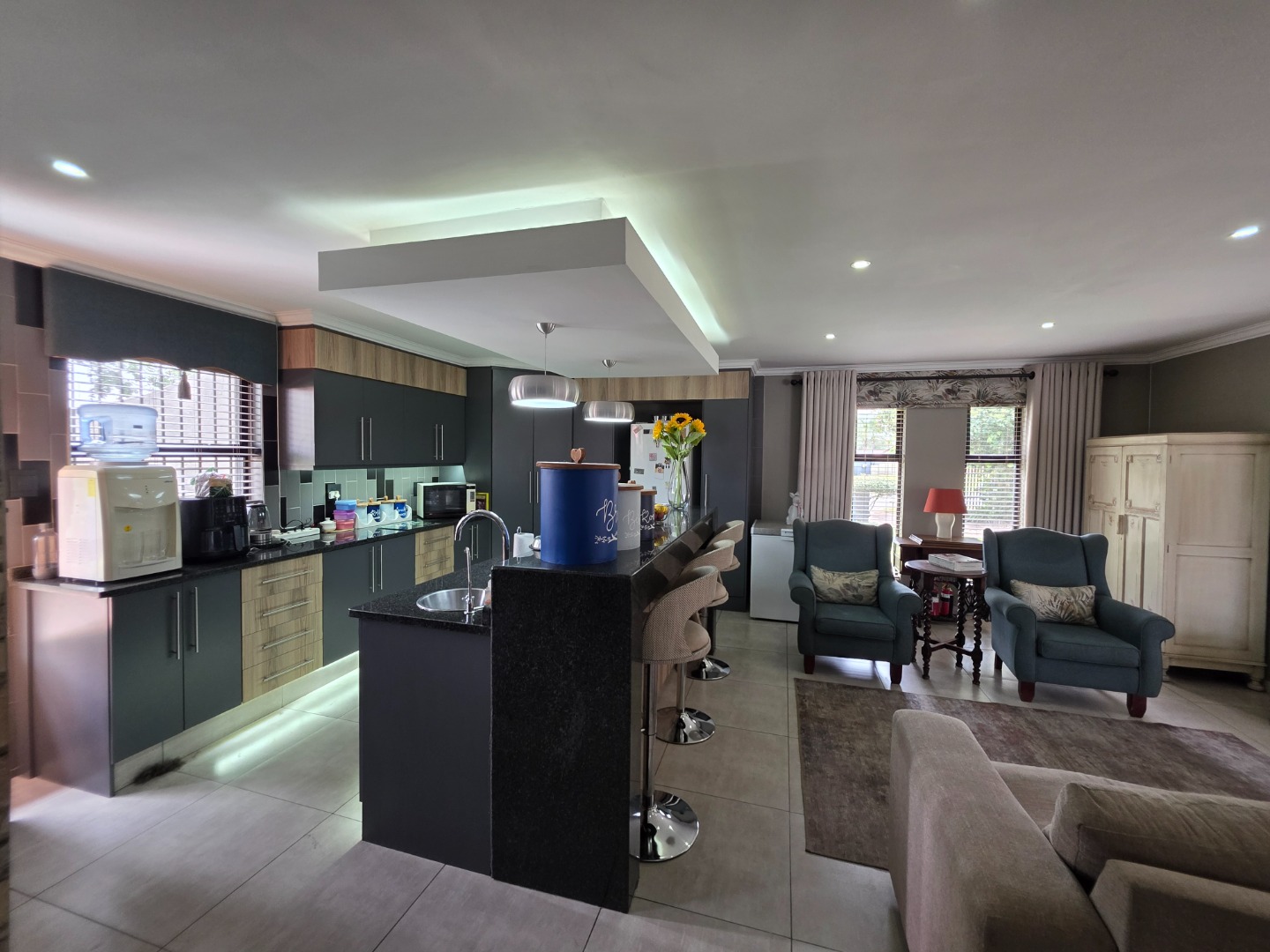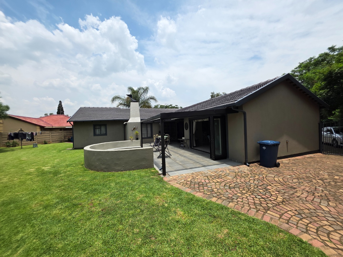 Outdoor living is equally exceptional, with an expansive garden providing a verdant backdrop for relaxation and recreation. A private patio, complete with a built-in braai and an inviting braai room, sets the stage for memorable al fresco gatherings. The property also offers a double garage and three additional parking spaces, catering to all vehicular needs. Pets are warmly welcomed, ensuring a complete family lifestyle.