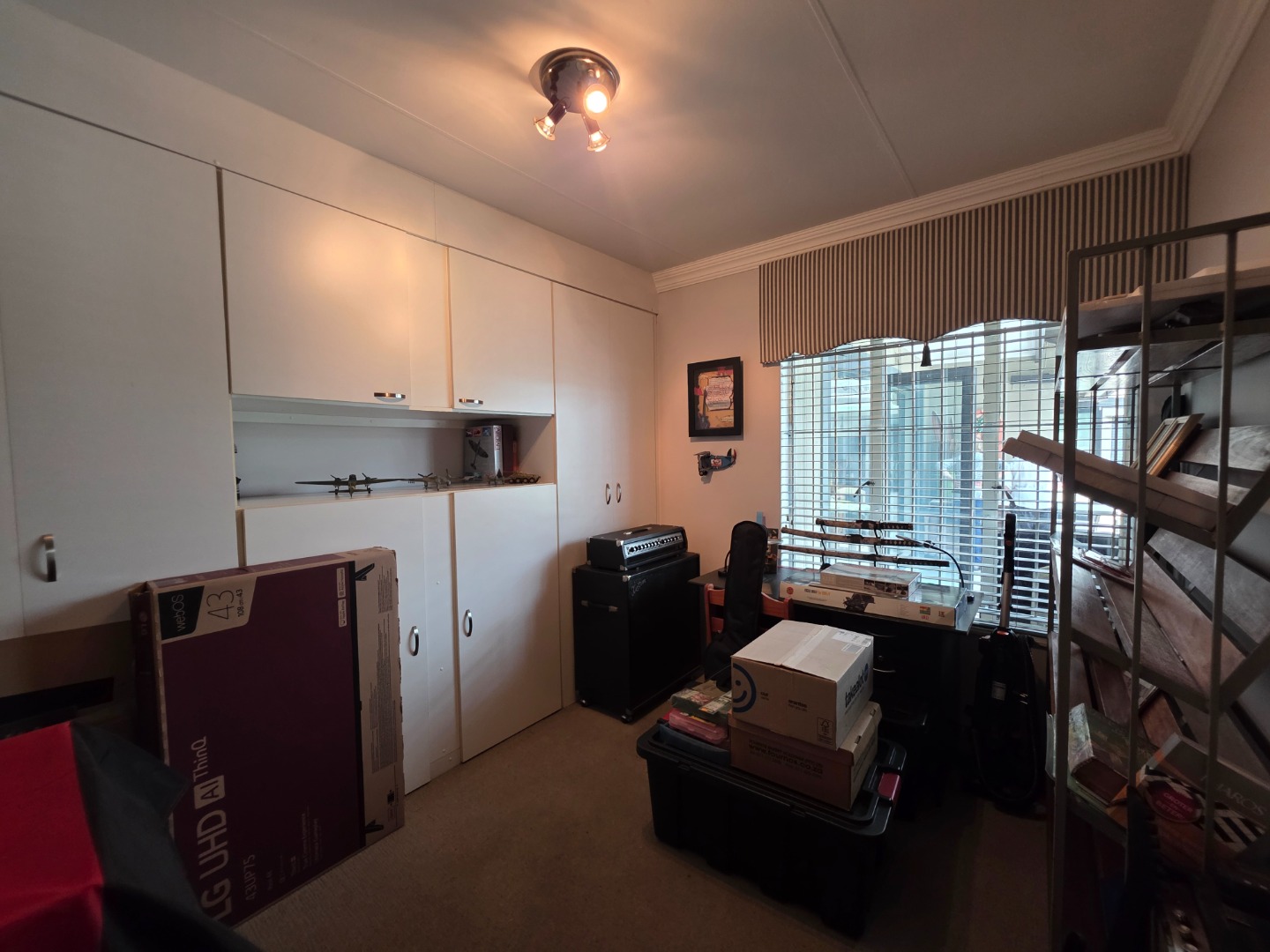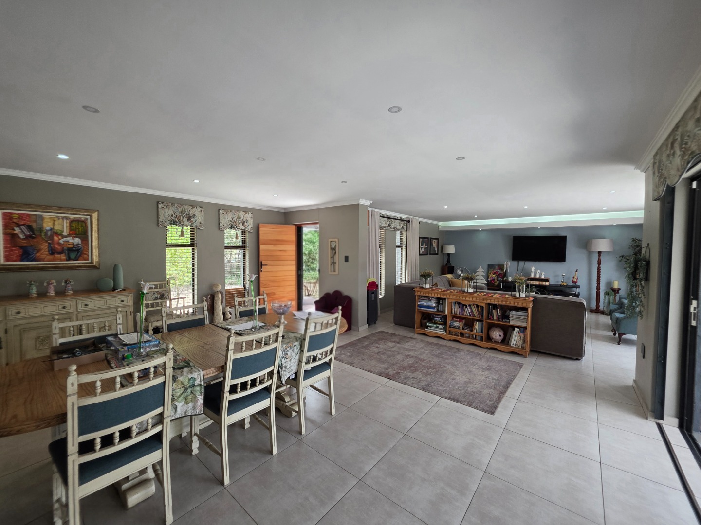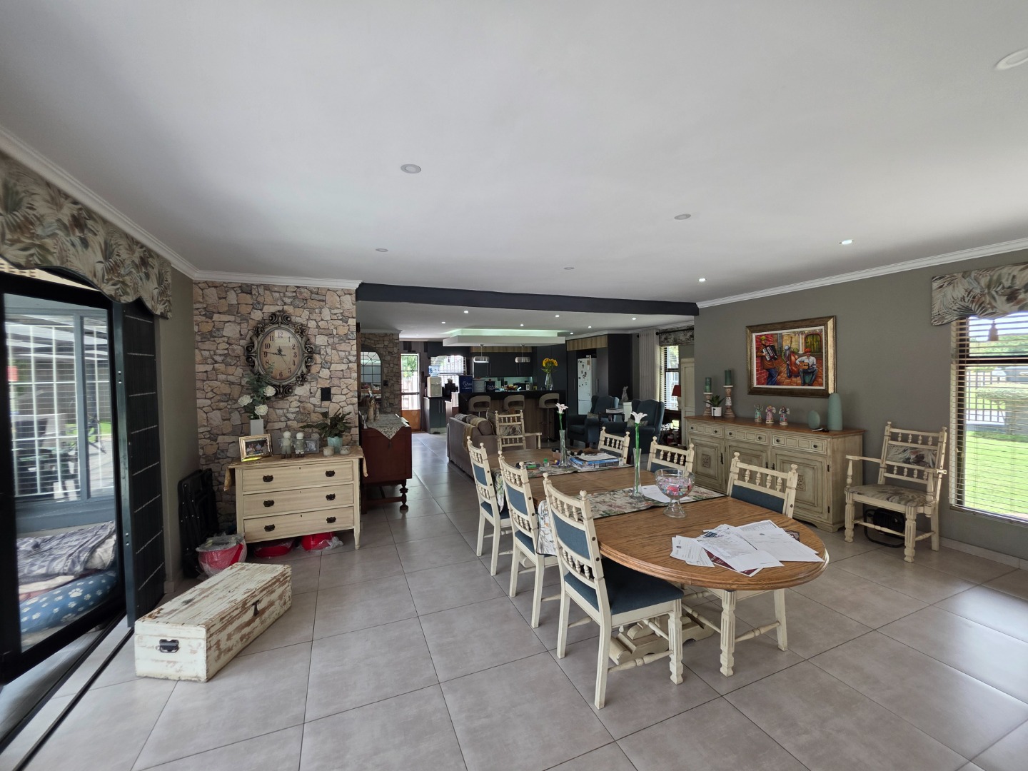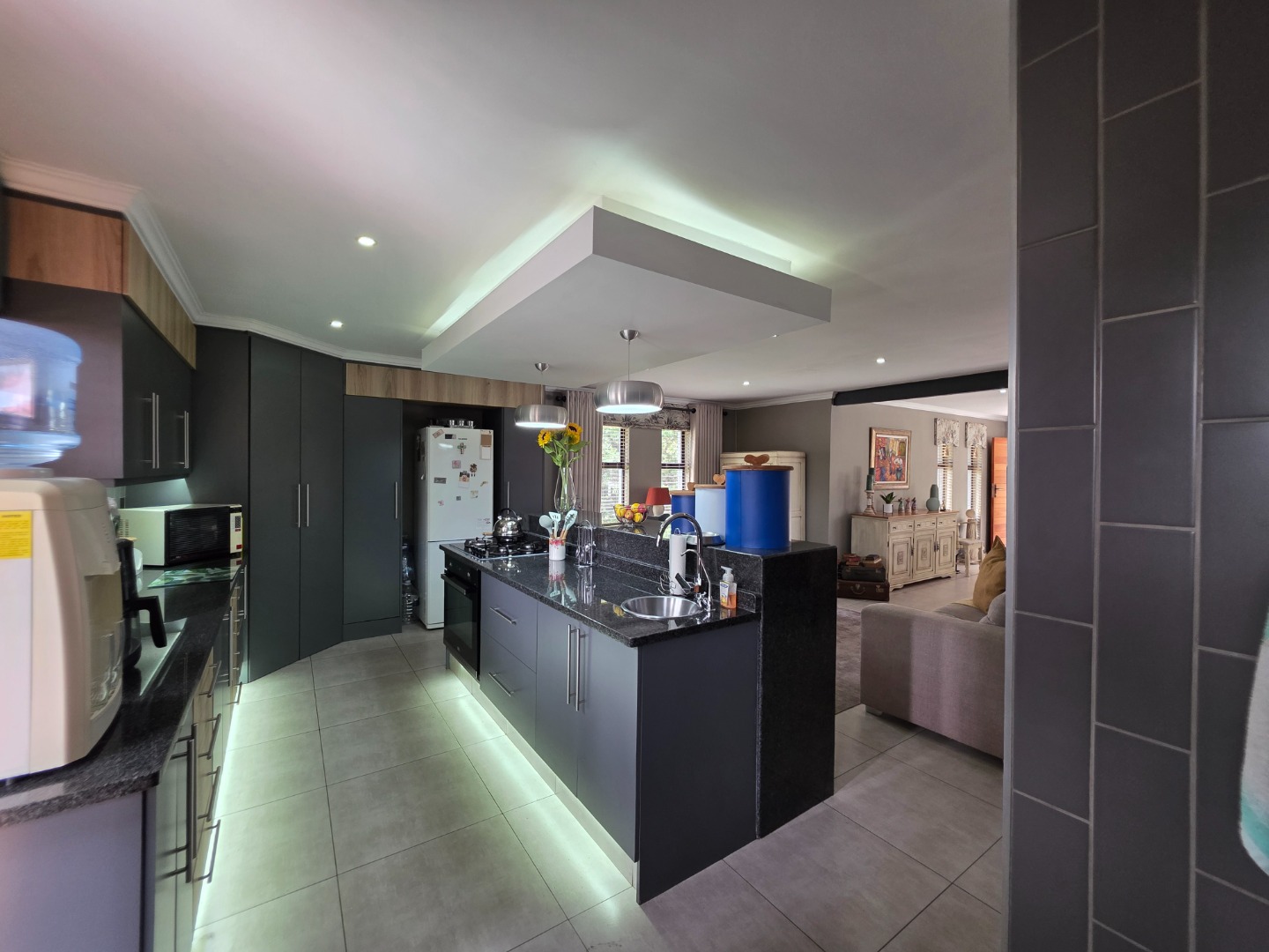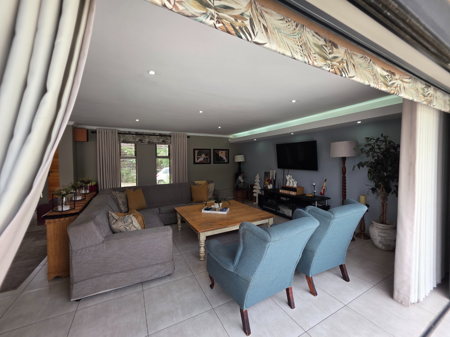 Outdoor living is equally exceptional, with an expansive garden providing a verdant backdrop for relaxation and recreation. A private patio, complete with a built-in braai and an inviting braai room, sets the stage for memorable al fresco gatherings. The property also offers a double garage and three additional parking spaces, catering to all vehicular needs. Pets are warmly welcomed, ensuring a complete family lifestyle.