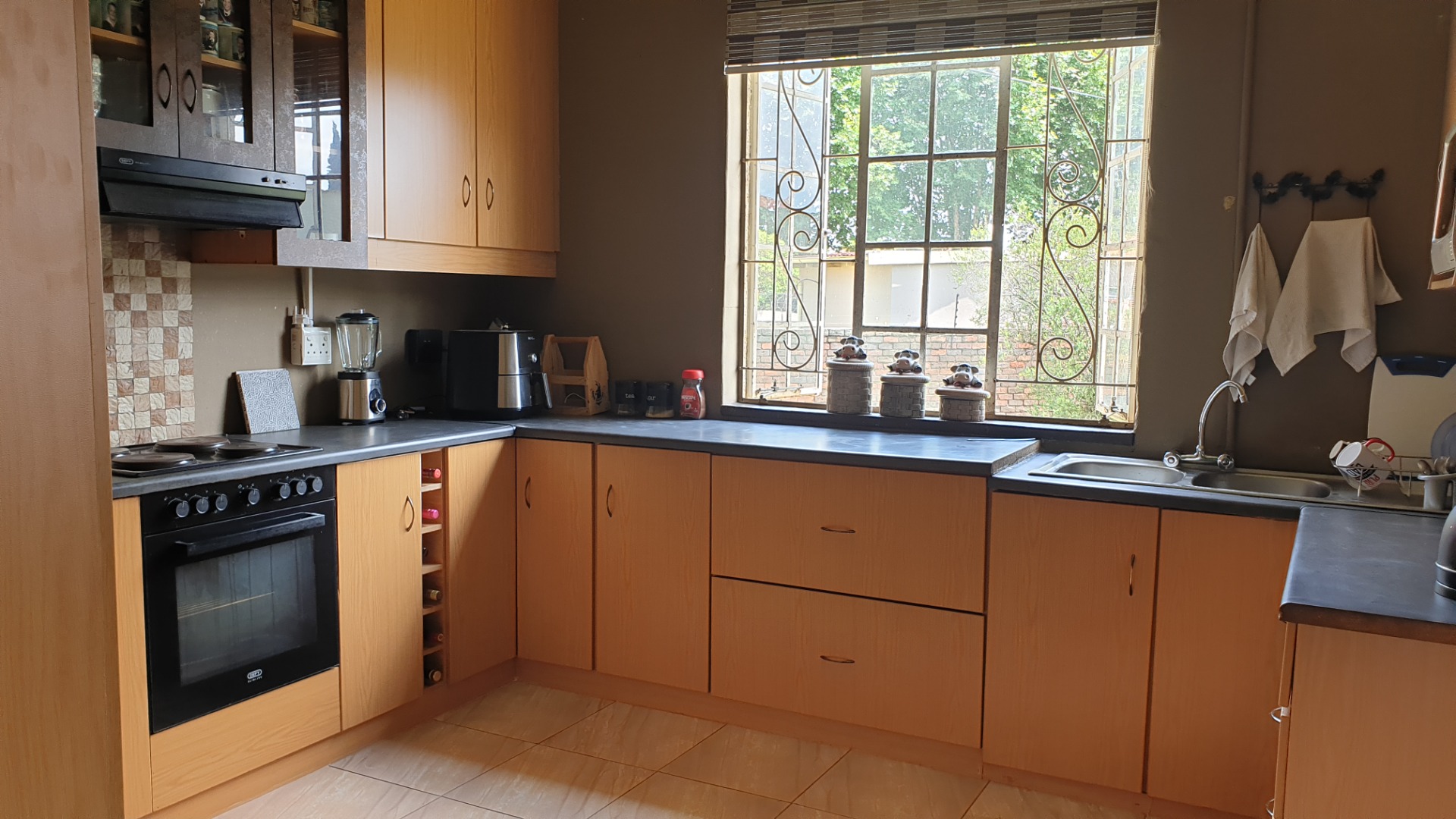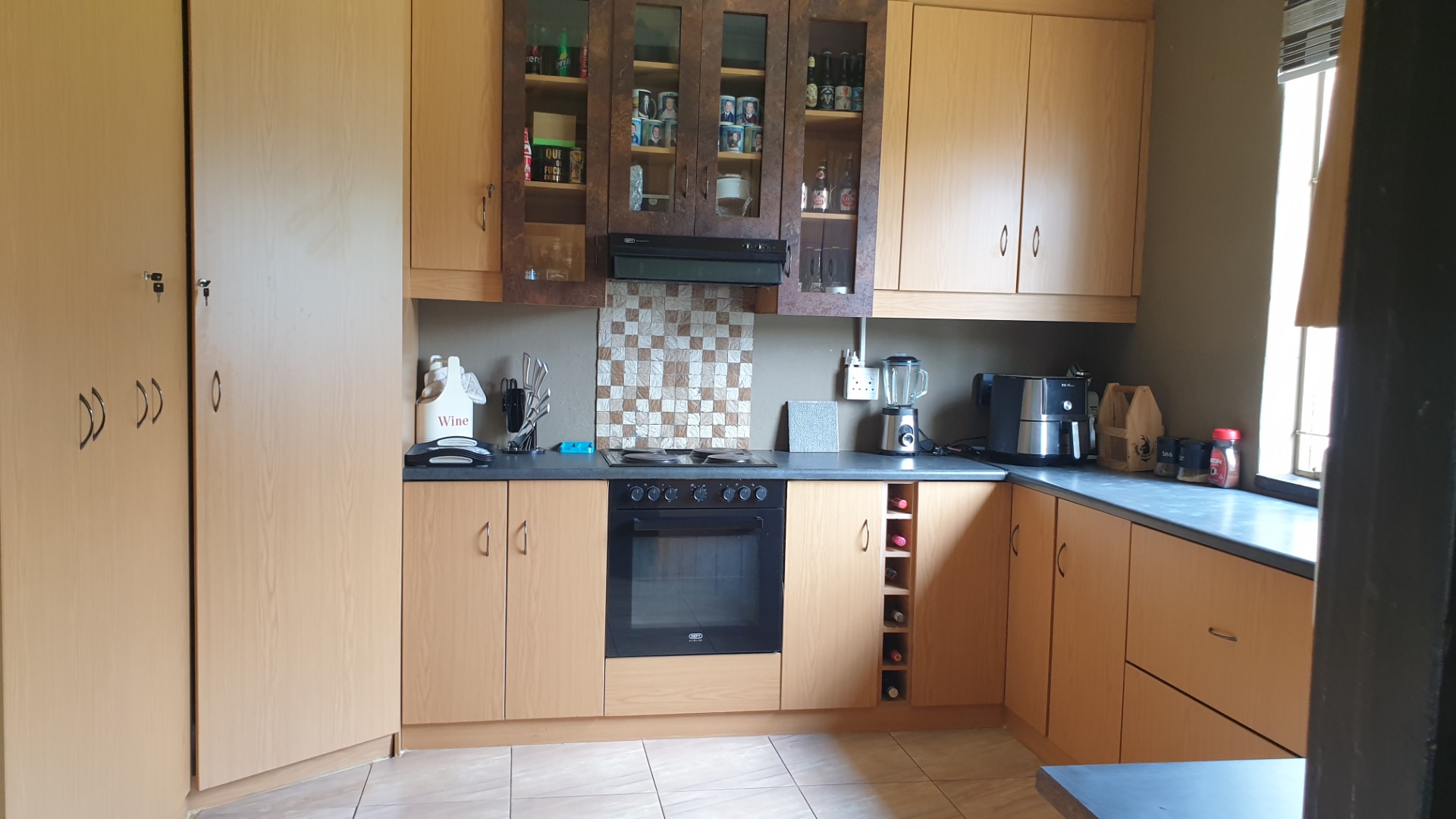 Modern kitchen with lots of cupboards , separate laundry and pantry .