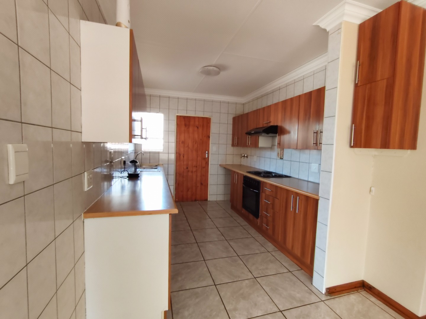 Modern Kitchen – plenty of cupboard space, under-counter oven, electric hob, and extractor fan.