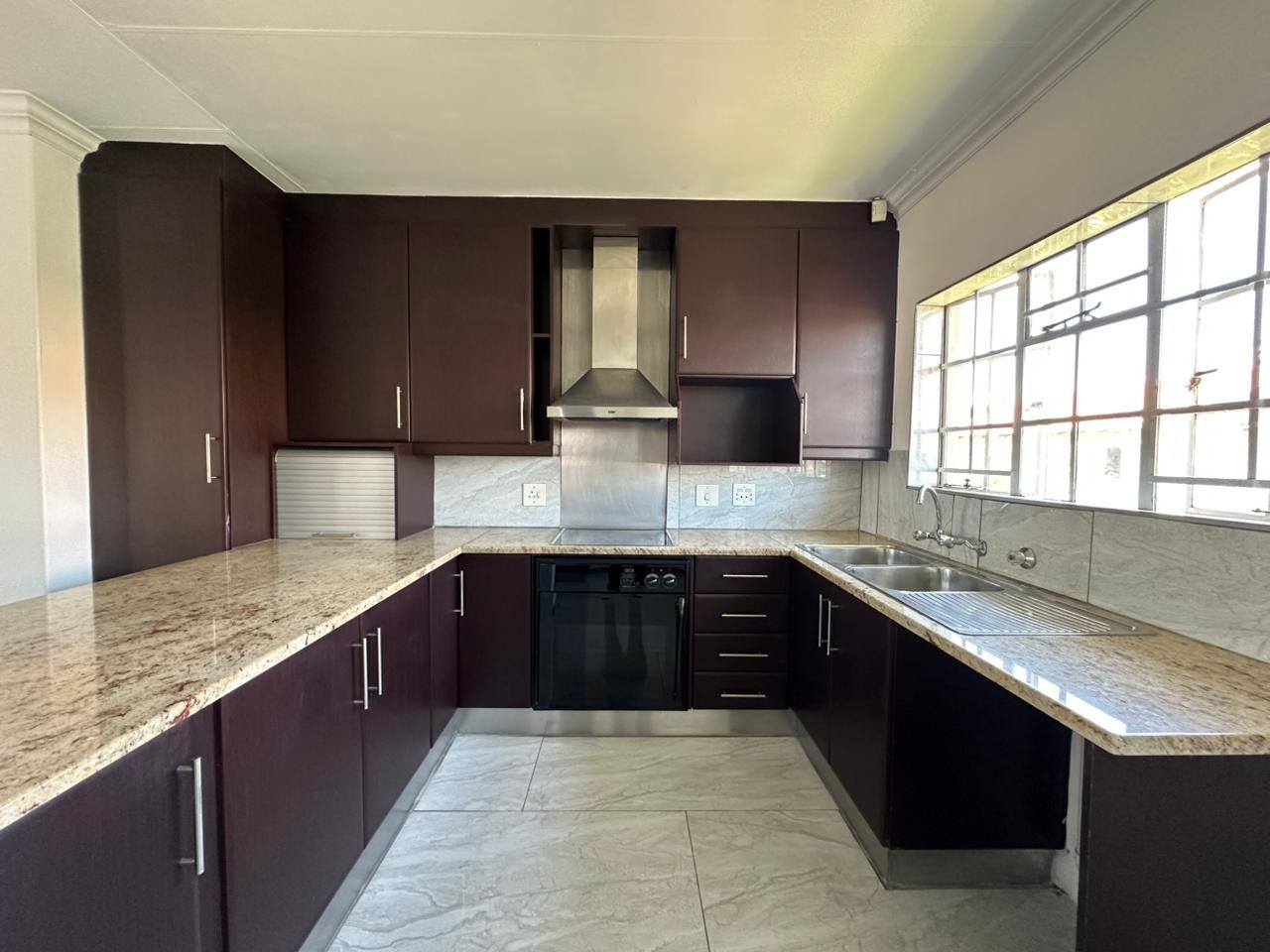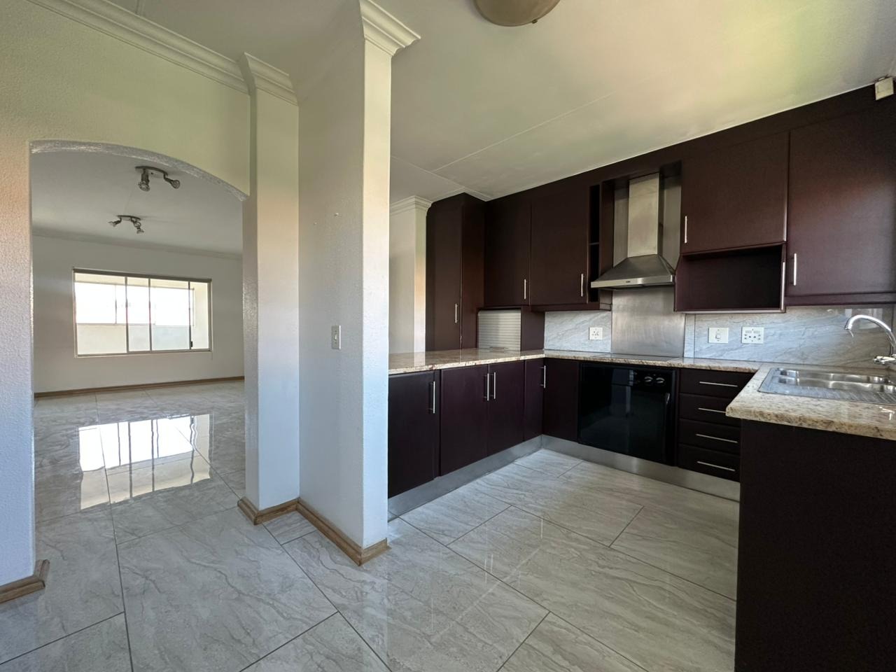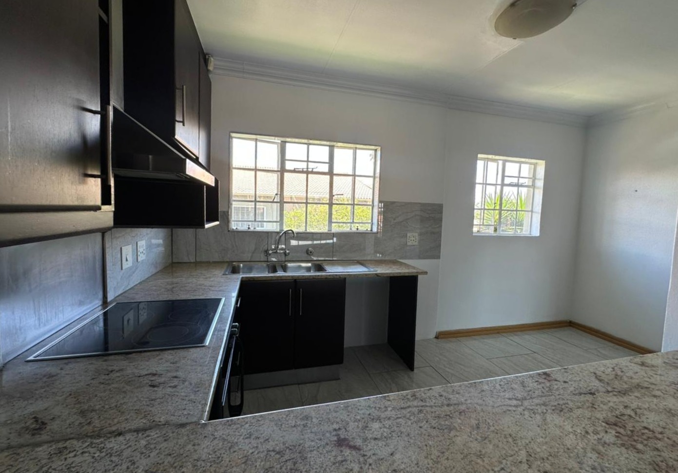 This inviting 2.5-bedroom, 1-bathroom apartment offers a comfortable living experience within a secure complex. Spanning 91.00 sqm, the residence features an open-plan layout that seamlessly connects the living areas. The modern kitchen is well-appointed with dark wood cabinetry, light granite countertops, an integrated oven and extractor fan, complemented by a double sink and ample natural light from a large window. Throughout the main living spaces and kitchen, you'll find contemporary tiled flooring, creating a clean and cohesive aesthetic. The half room can also be used as a study or a sunroom for those cozy winter days.