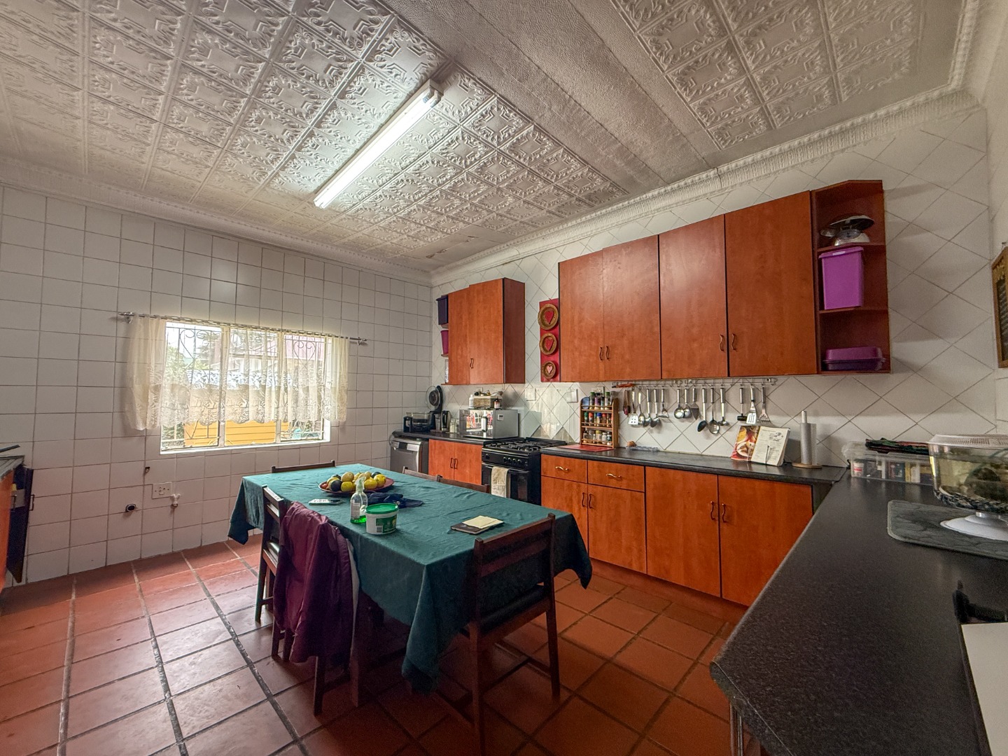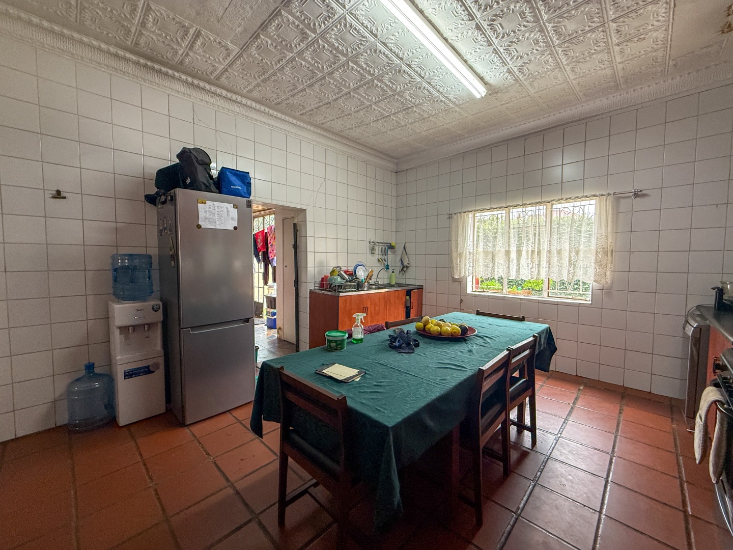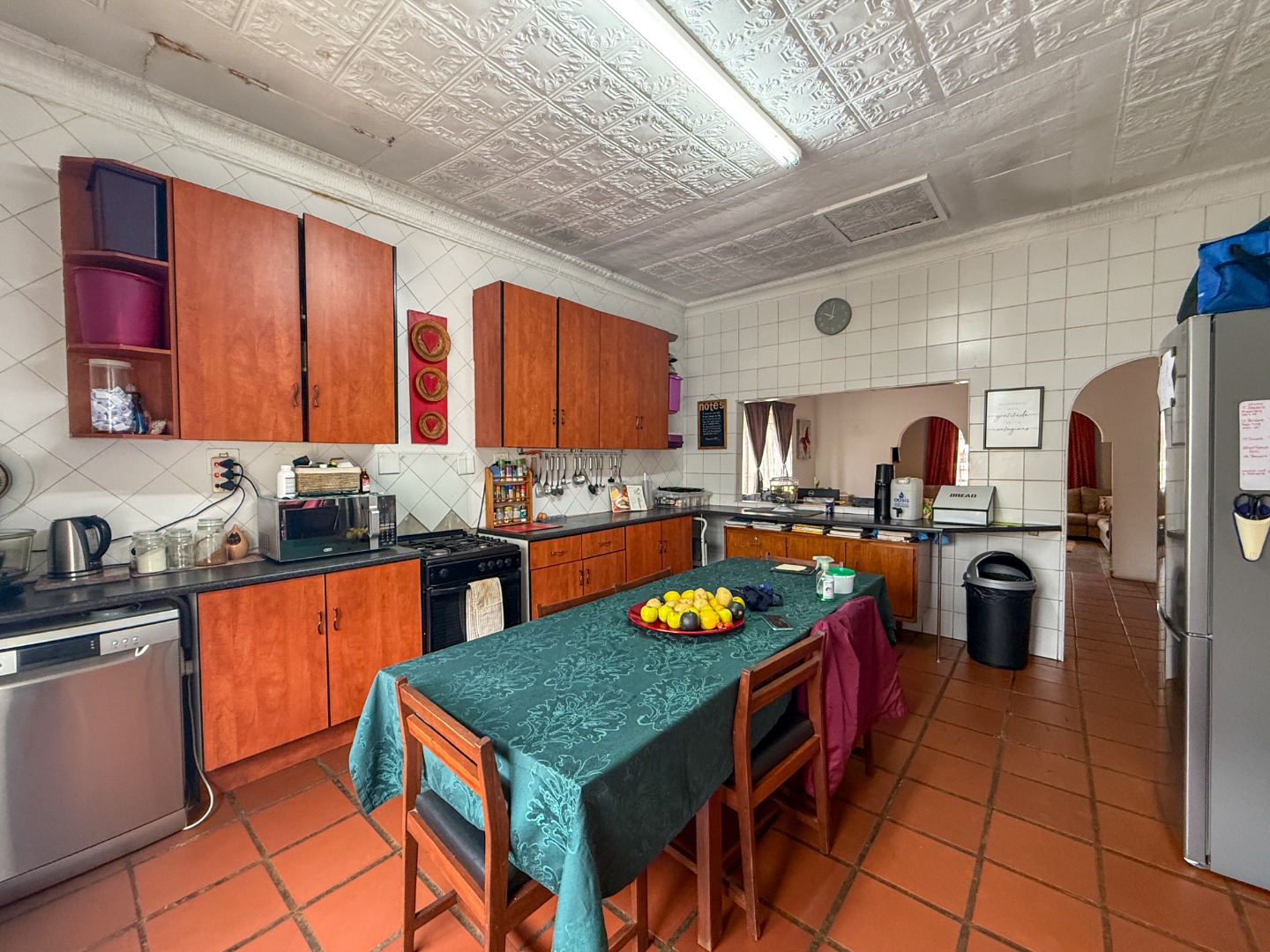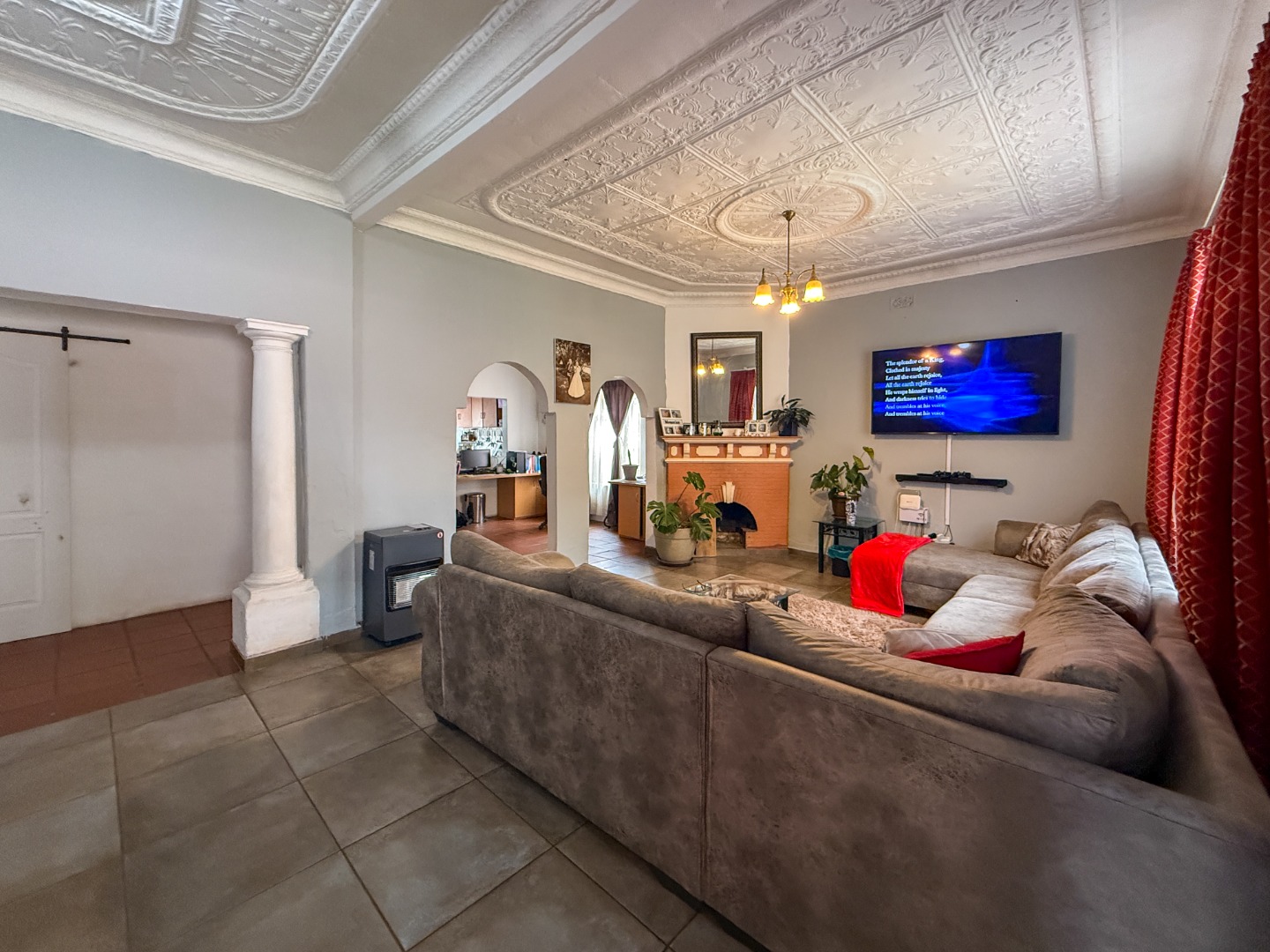Upon entry, the interior reveals spacious living areas distinguished by ornate decorative ceilings and durable tiled flooring throughout. The layout includes a dedicated lounge and a separate dining room, providing ample space for both relaxation and formal entertaining. The functional kitchen boasts extensive wood cabinetry, terracotta-style floor tiles, and an integrated dining area, all beneath a unique decorative ceiling.