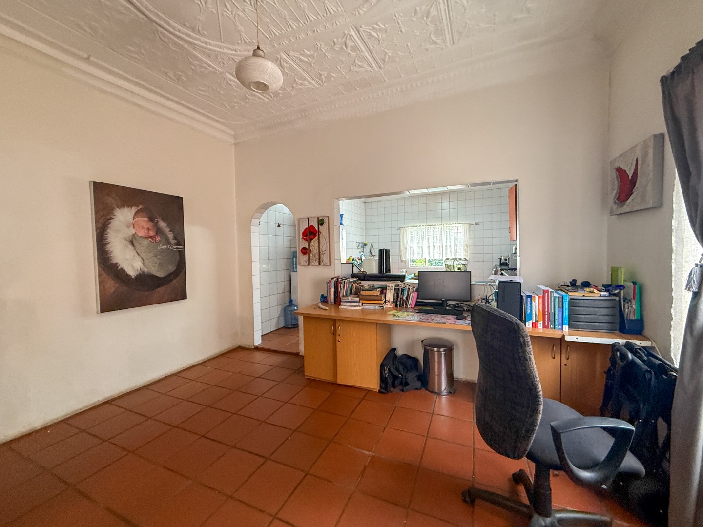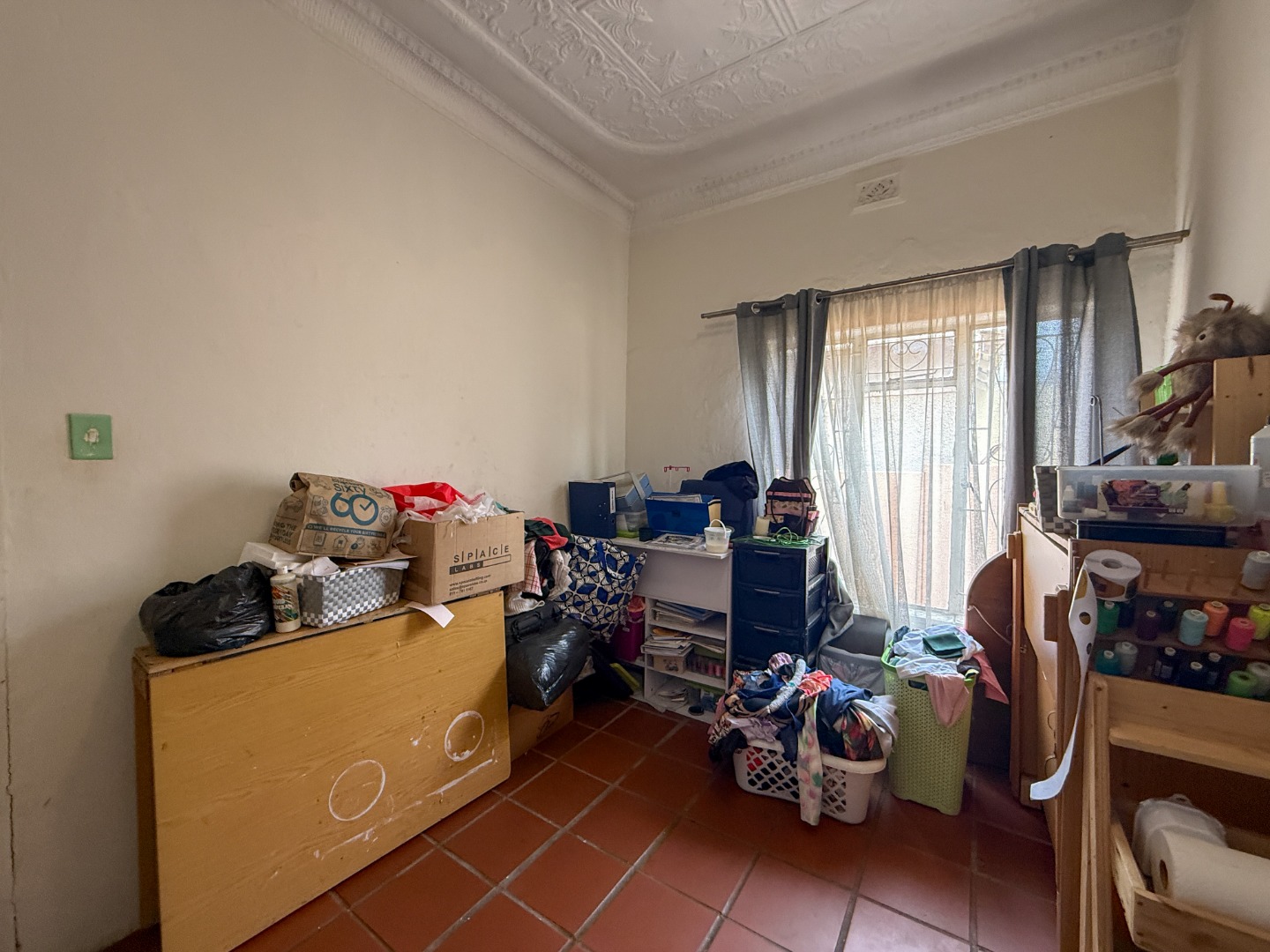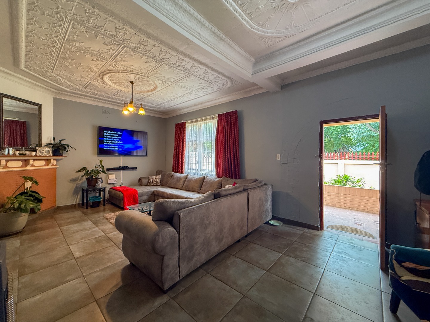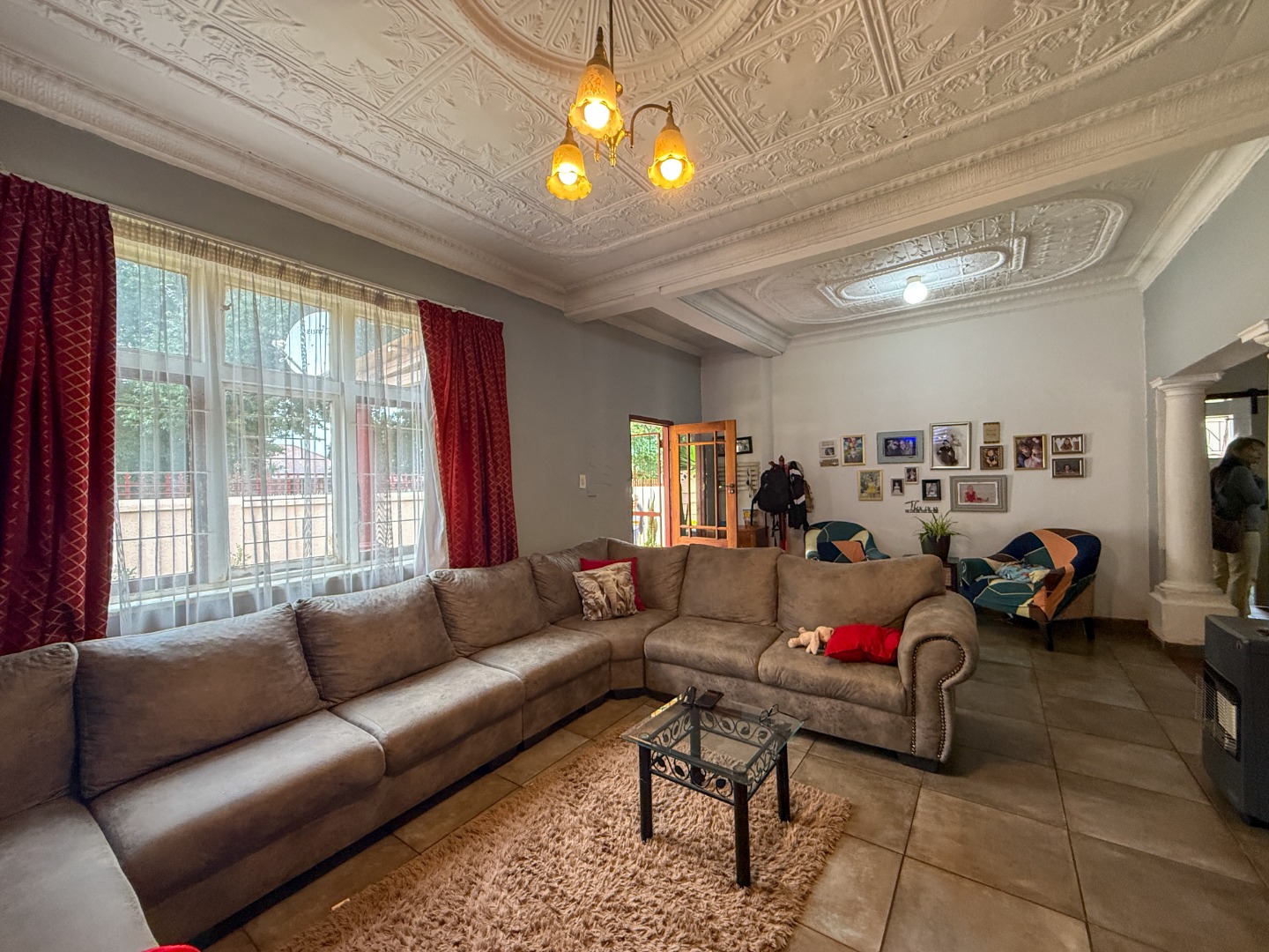 Upon entry, the interior reveals spacious living areas distinguished by ornate decorative ceilings and durable tiled flooring throughout. The layout includes a dedicated lounge and a separate dining room, providing ample space for both relaxation and formal entertaining. The functional kitchen boasts extensive wood cabinetry, terracotta-style floor tiles, and an integrated dining area, all beneath a unique decorative ceiling.