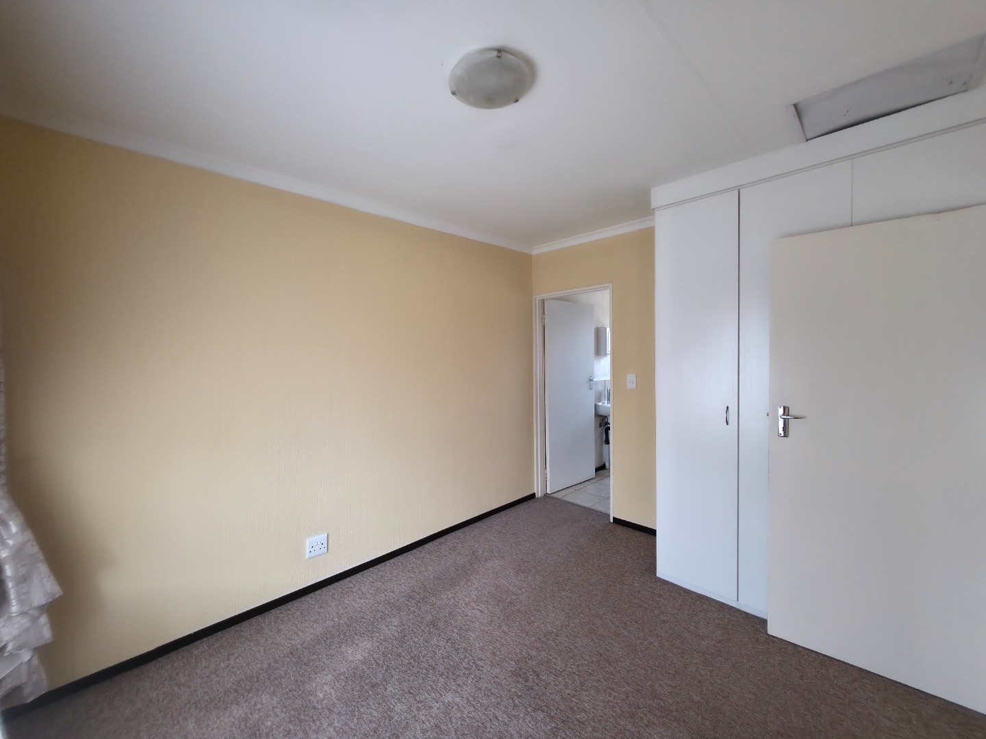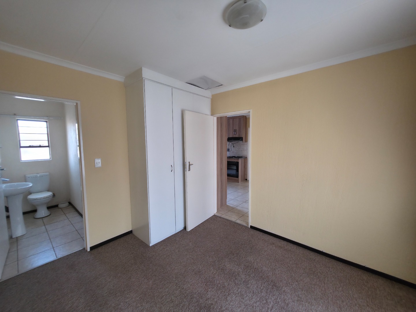 The residence boasts three carpeted bedrooms, each equipped with built-in wardrobes for practical storage solutions. The two bathrooms include a convenient en-suite, both featuring modern fixtures such as a pedestal sink, toilet, and a glass-enclosed shower, ensuring comfort and privacy. A window in the bathroom provides natural light and ventilation.