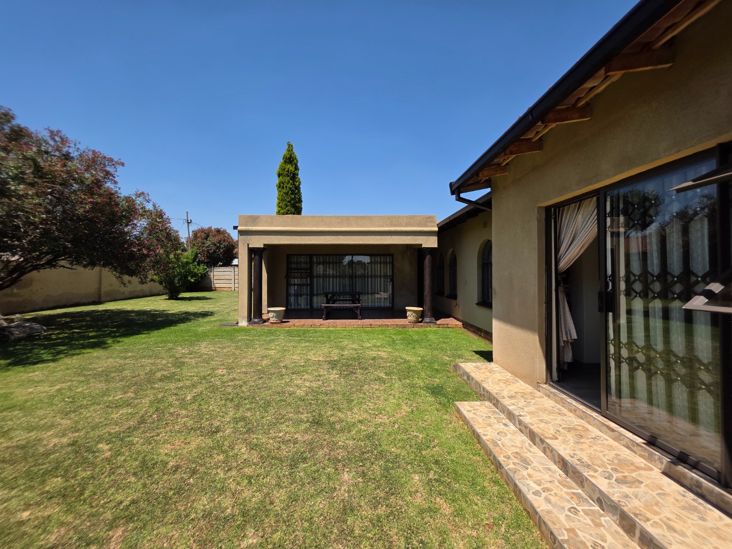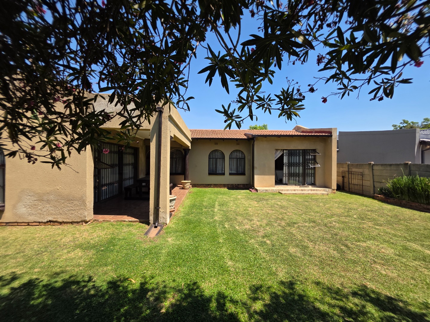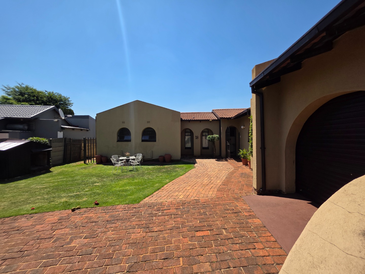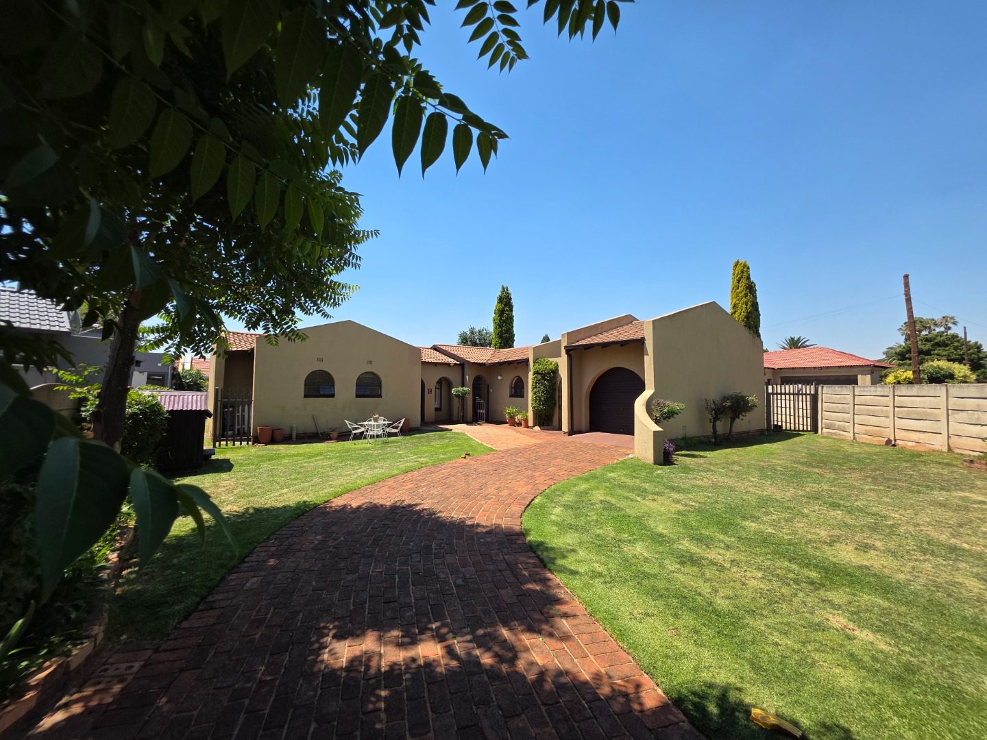 Discover this charming single-story home in the suburban heart of Dawn Park, Boksburg, South Africa, offering a blend of comfort and practicality. The property immediately impresses with its warm, earthy-toned stucco exterior, distinctive arched windows, and traditional tiled roof, all set amidst a generous, well-manicured lawn. A curved brick-paved driveway leads to the main entrance, complemented by mature trees and a welcoming covered outdoor patio, perfect for relaxation and alfresco dining.