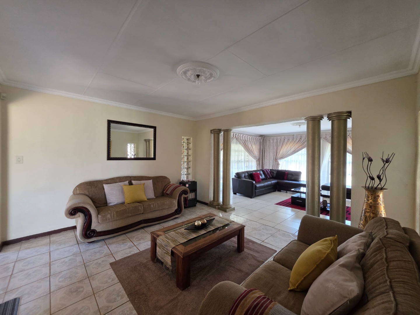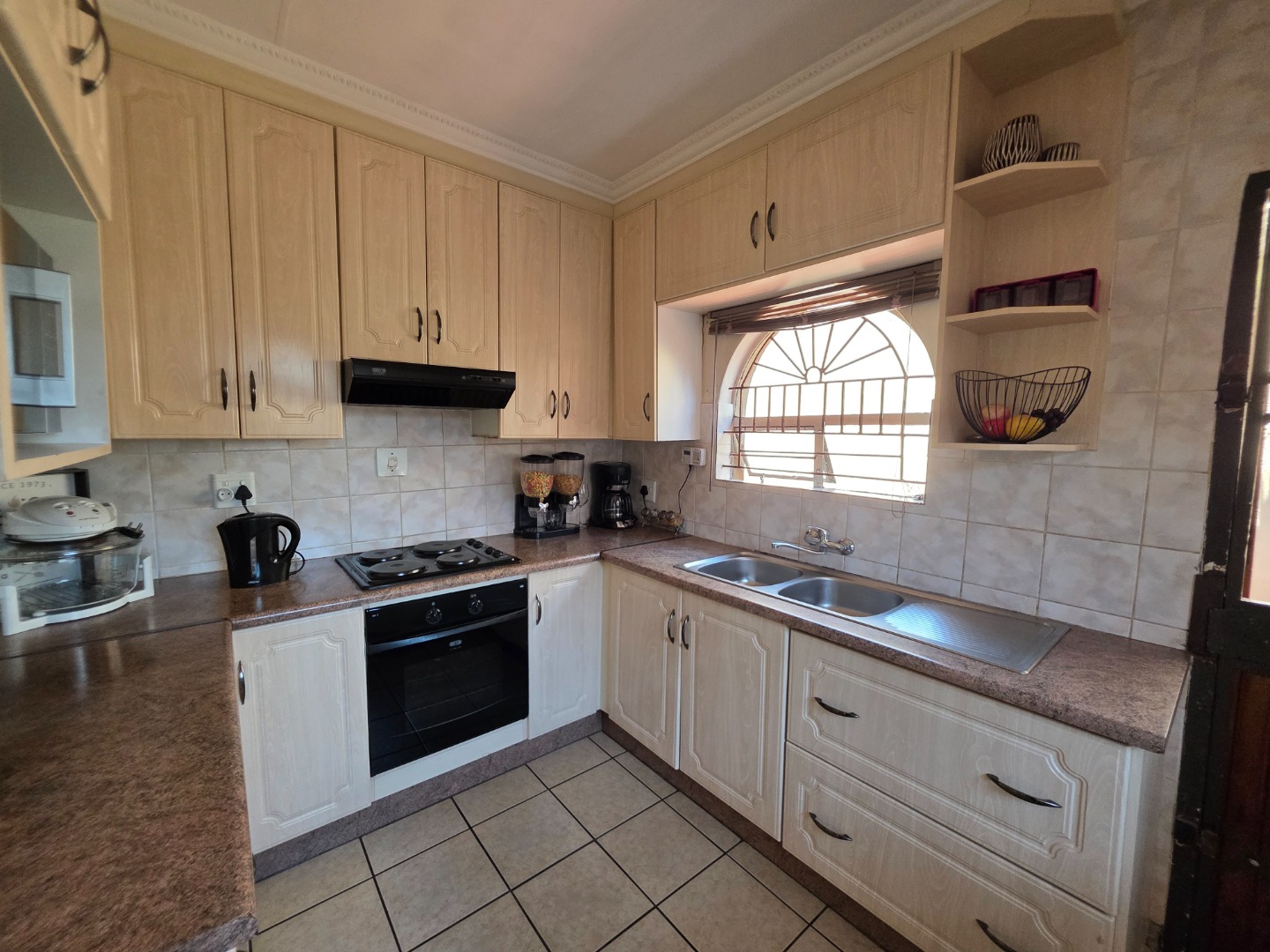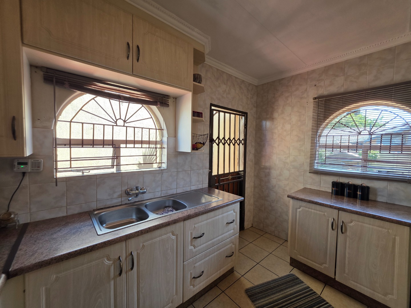 Discover this charming single-story home in the suburban heart of Dawn Park, Boksburg, South Africa, offering a blend of comfort and practicality. The property immediately impresses with its warm, earthy-toned stucco exterior, distinctive arched windows, and traditional tiled roof, all set amidst a generous, well-manicured lawn. A curved brick-paved driveway leads to the main entrance, complemented by mature trees and a welcoming covered outdoor patio, perfect for relaxation and alfresco dining.