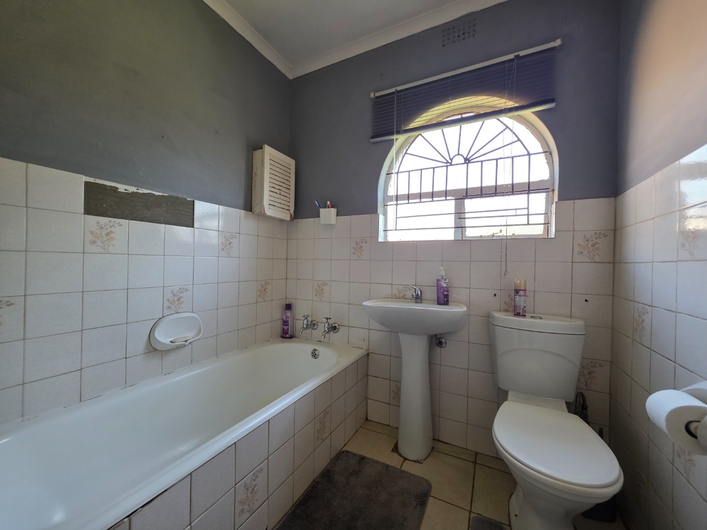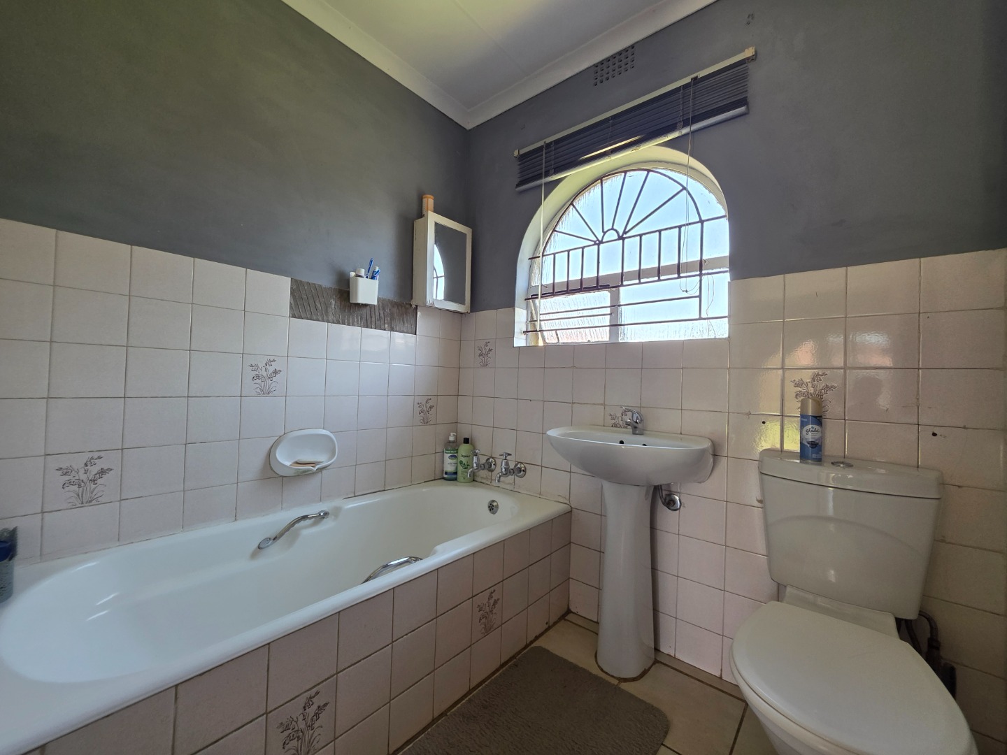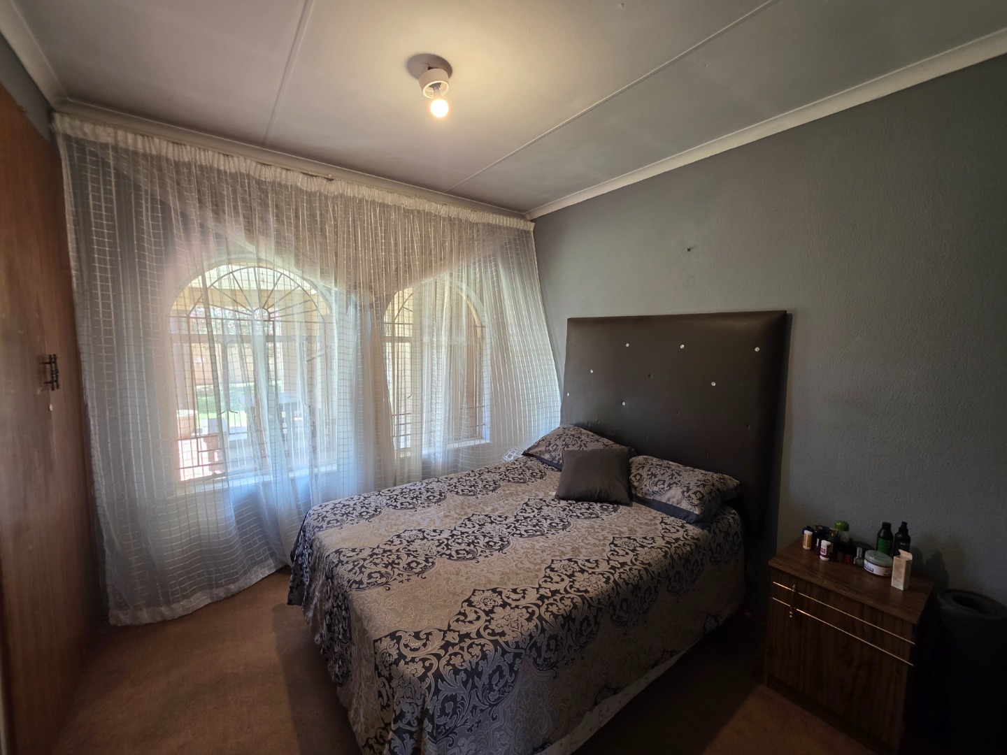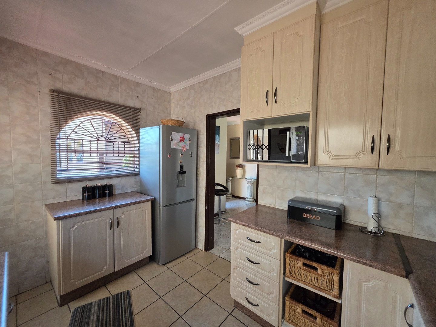 Discover this charming single-story home in the suburban heart of Dawn Park, Boksburg, South Africa, offering a blend of comfort and practicality. The property immediately impresses with its warm, earthy-toned stucco exterior, distinctive arched windows, and traditional tiled roof, all set amidst a generous, well-manicured lawn. A curved brick-paved driveway leads to the main entrance, complemented by mature trees and a welcoming covered outdoor patio, perfect for relaxation and alfresco dining.