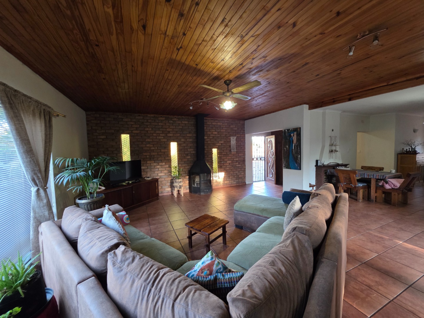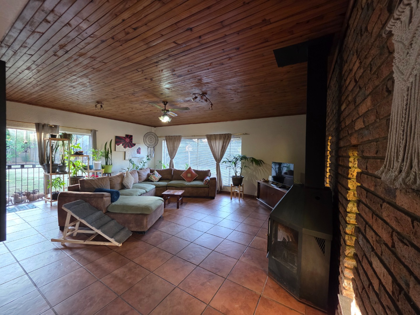 Upon entry, the interior reveals a thoughtfully designed layout encompassing an entrance hall, a spacious lounge, a dedicated dining room, all benefiting from an open-plan design. The living areas are characterised by charming wood ceilings and durable tiled flooring, creating a warm and inviting atmosphere. A functional fireplace serves as a focal point, while sliding doors facilitate seamless transitions to the outdoor spaces, inviting natural light throughout.