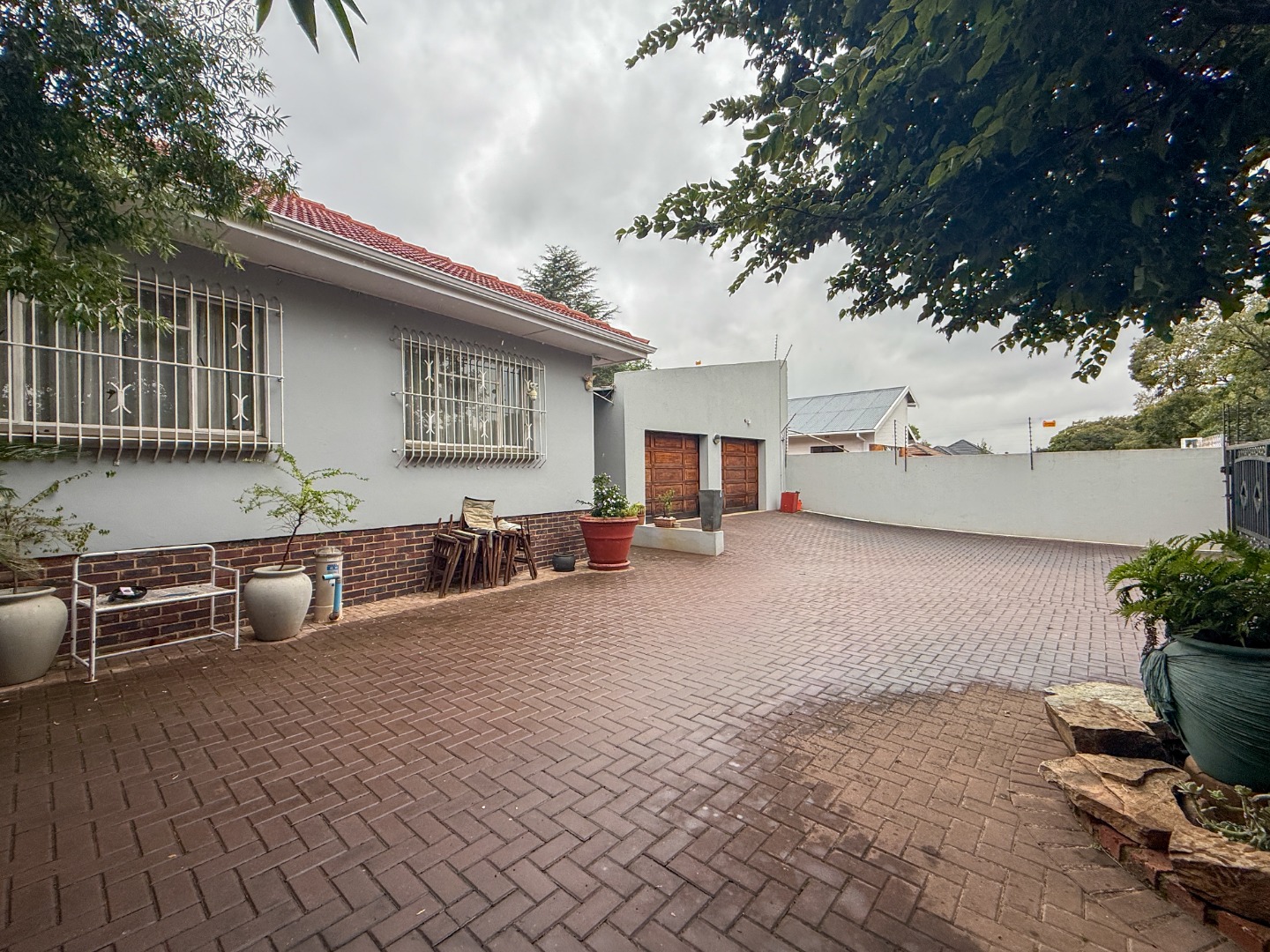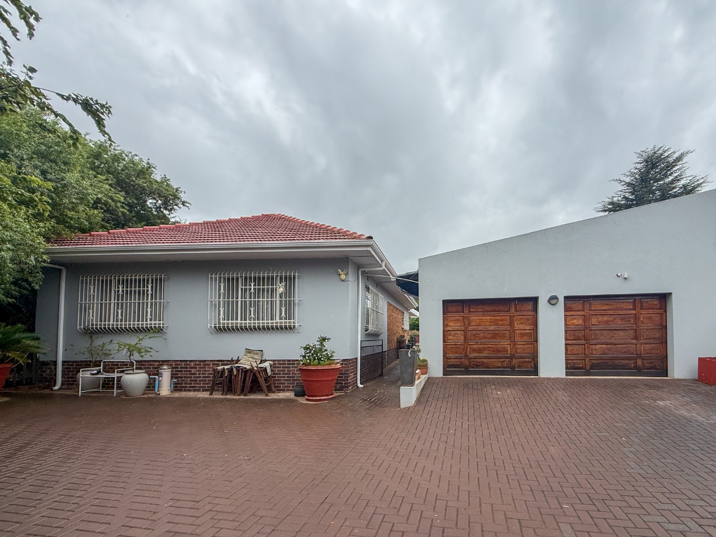 The main residence, featuring a light-toned exterior and a classic red-tiled roof, is complemented by a separate double garage and an expansive brick-paved driveway. Mature greenery enhances the property's frontage, offering a welcoming aesthetic.