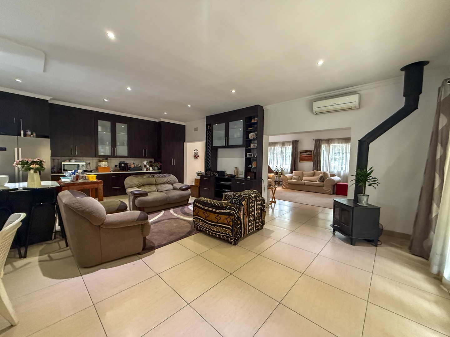 Upon entry, the residence unfolds into a generously proportioned open-plan living area, seamlessly integrating the kitchen, dining, and lounge spaces. The contemporary kitchen is a focal point, boasting sleek dark cabinetry, a substantial island with a gas hob and overhead extractor, and ample storage. Tiled flooring extends throughout these communal areas, which are further enhanced by recessed lighting, air conditioning, and a freestanding fireplace, ensuring comfort and versatility for both daily living and entertaining. Large windows invite abundant natural light, creating an airy ambiance.