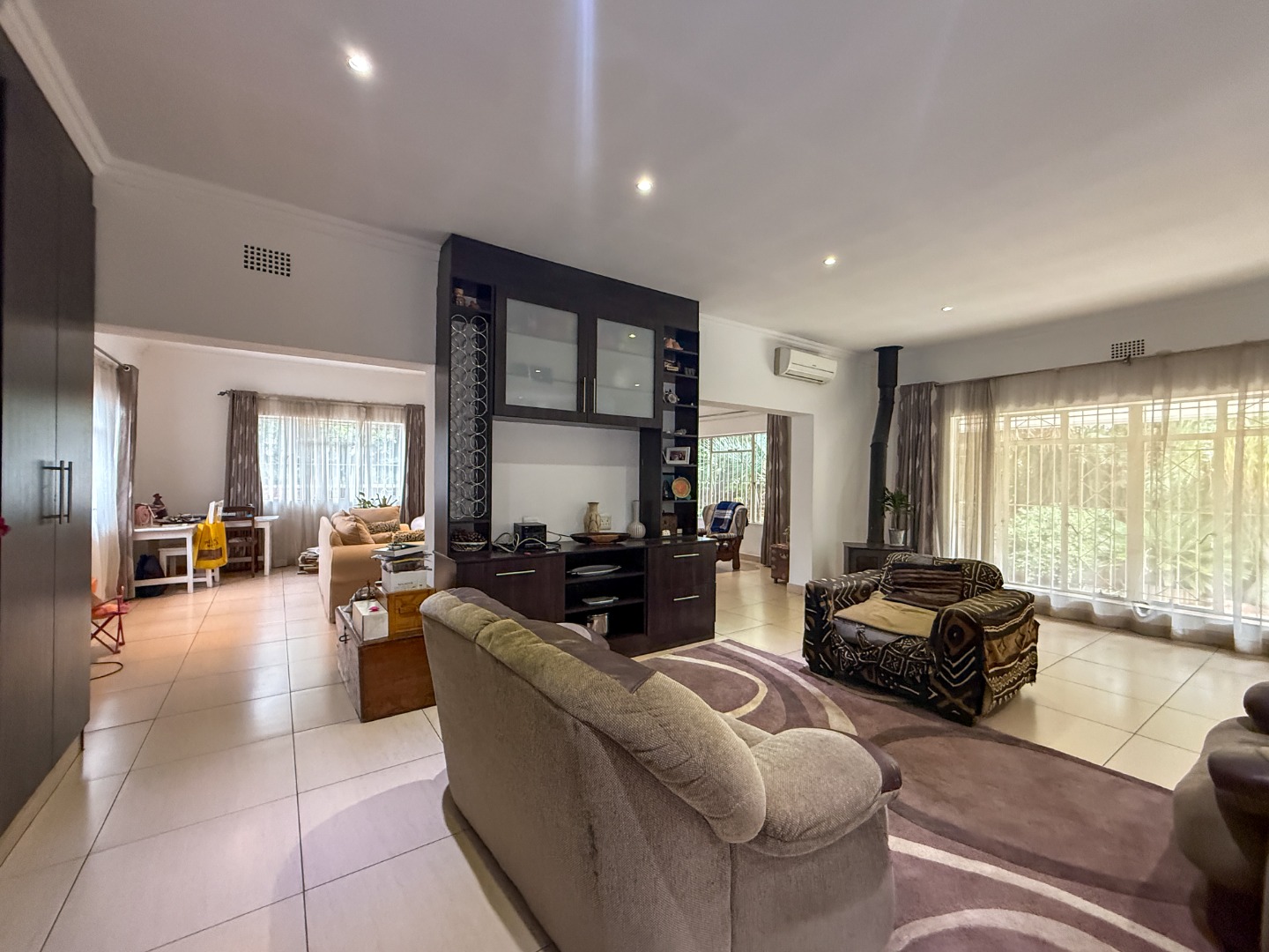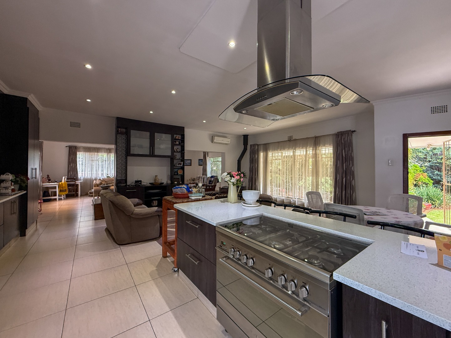 Upon entry, the residence unfolds into a generously proportioned open-plan living area, seamlessly integrating the kitchen, dining, and lounge spaces. The contemporary kitchen is a focal point, boasting sleek dark cabinetry, a substantial island with a gas hob and overhead extractor, and ample storage. Tiled flooring extends throughout these communal areas, which are further enhanced by recessed lighting, air conditioning, and a freestanding fireplace, ensuring comfort and versatility for both daily living and entertaining. Large windows invite abundant natural light, creating an airy ambiance.
