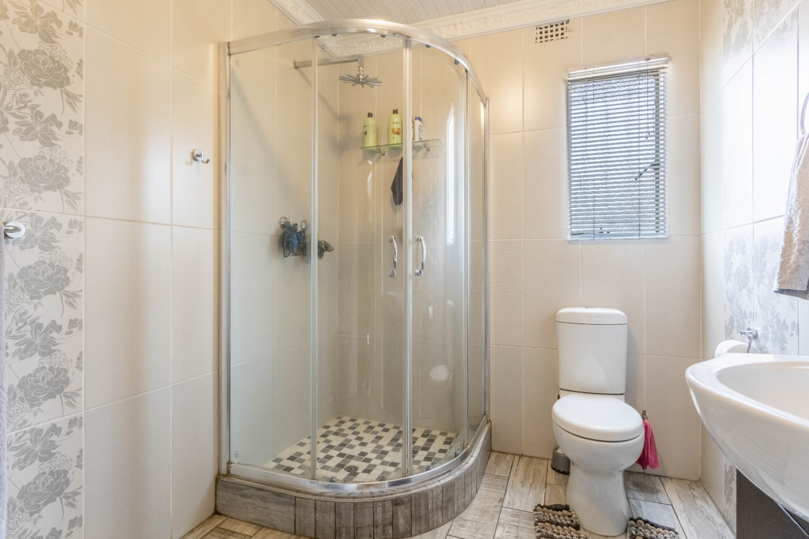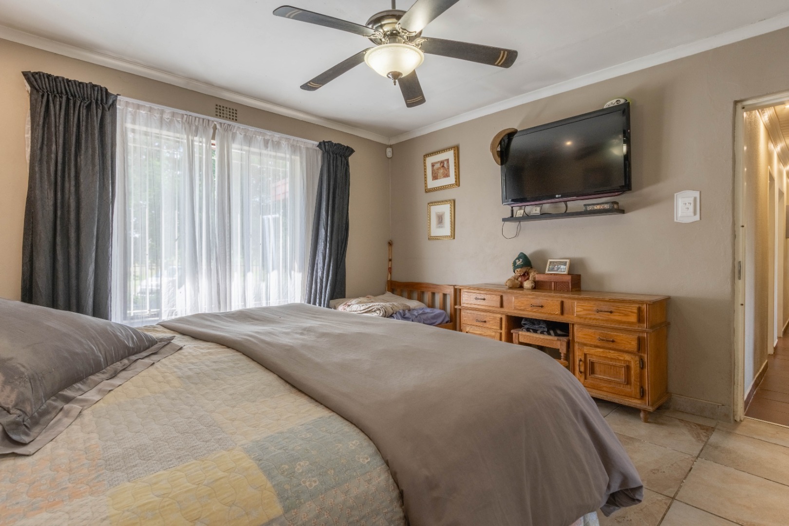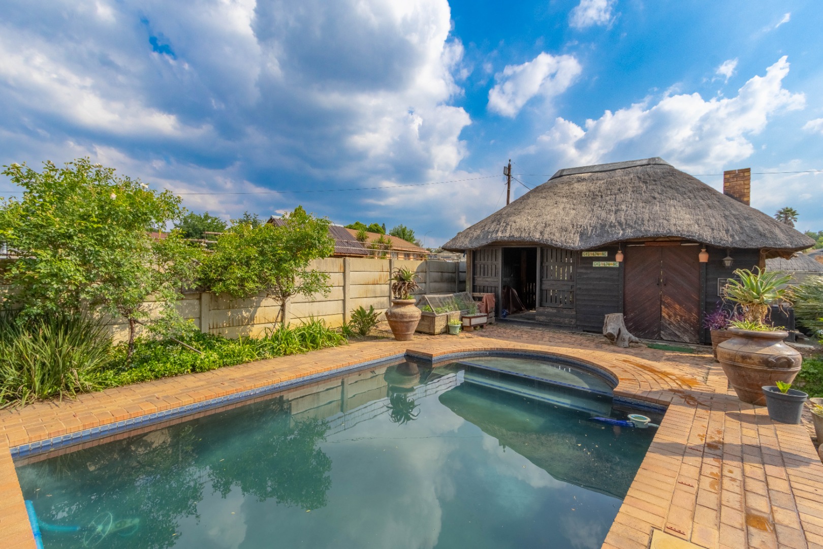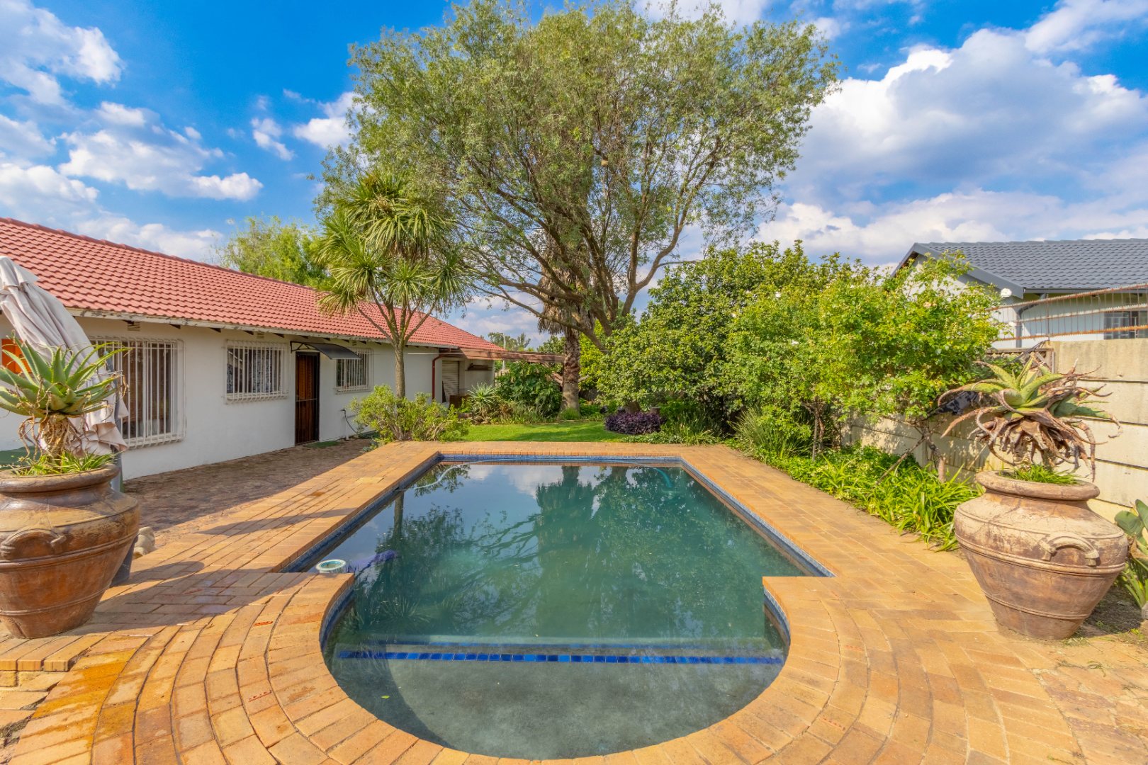 Outside, the expansive erf features a refreshing swimming pool and a well-maintained garden, perfect for outdoor enjoyment and pets. A paved driveway leads to a double garage and additional parking for two vehicles, ensuring ample space for residents and guests. The property presents a welcoming facade, offering a solid foundation for a family seeking space and comfort.