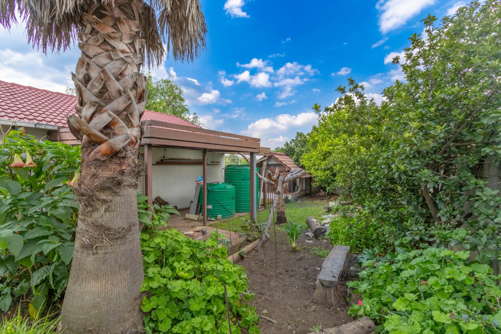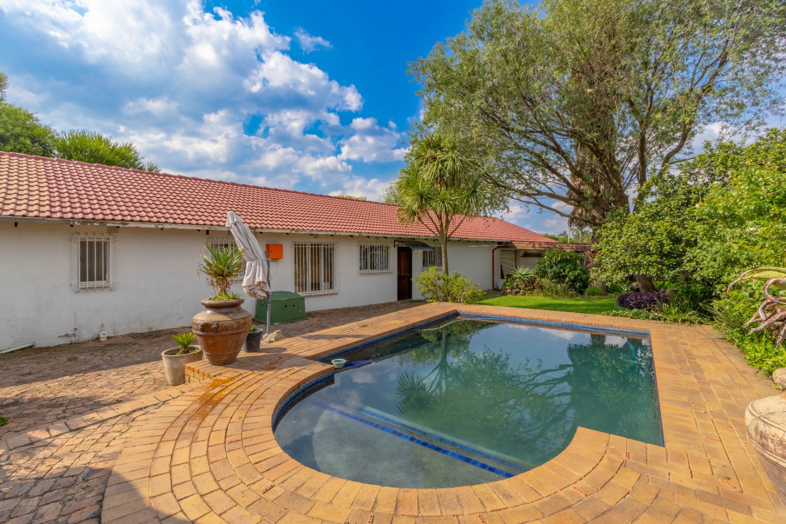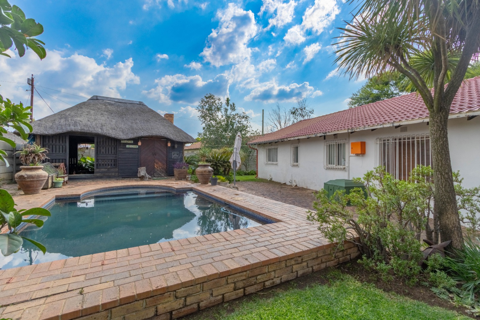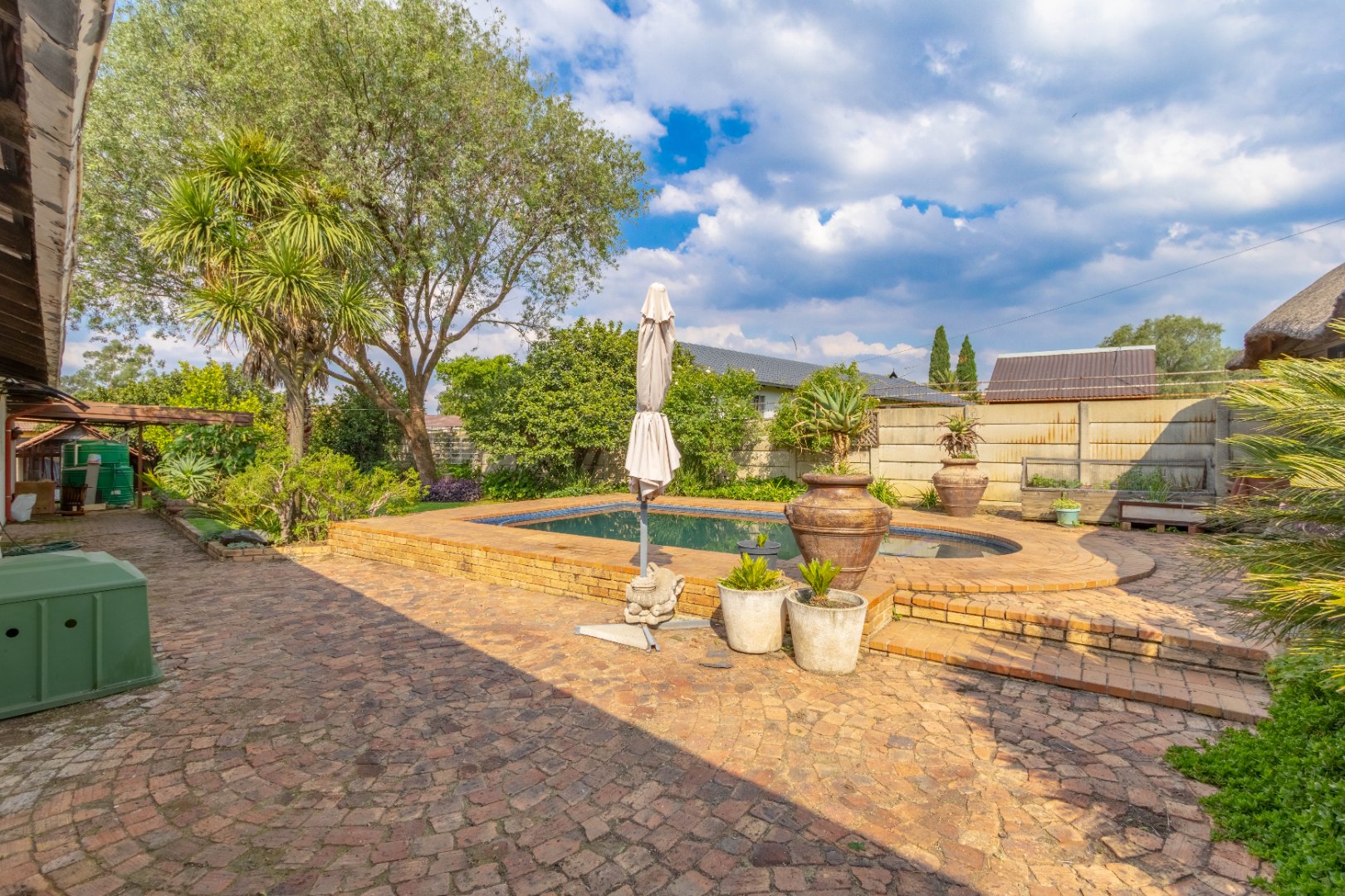 Outside, the expansive erf features a refreshing swimming pool and a well-maintained garden, perfect for outdoor enjoyment and pets. A paved driveway leads to a double garage and additional parking for two vehicles, ensuring ample space for residents and guests. The property presents a welcoming facade, offering a solid foundation for a family seeking space and comfort.