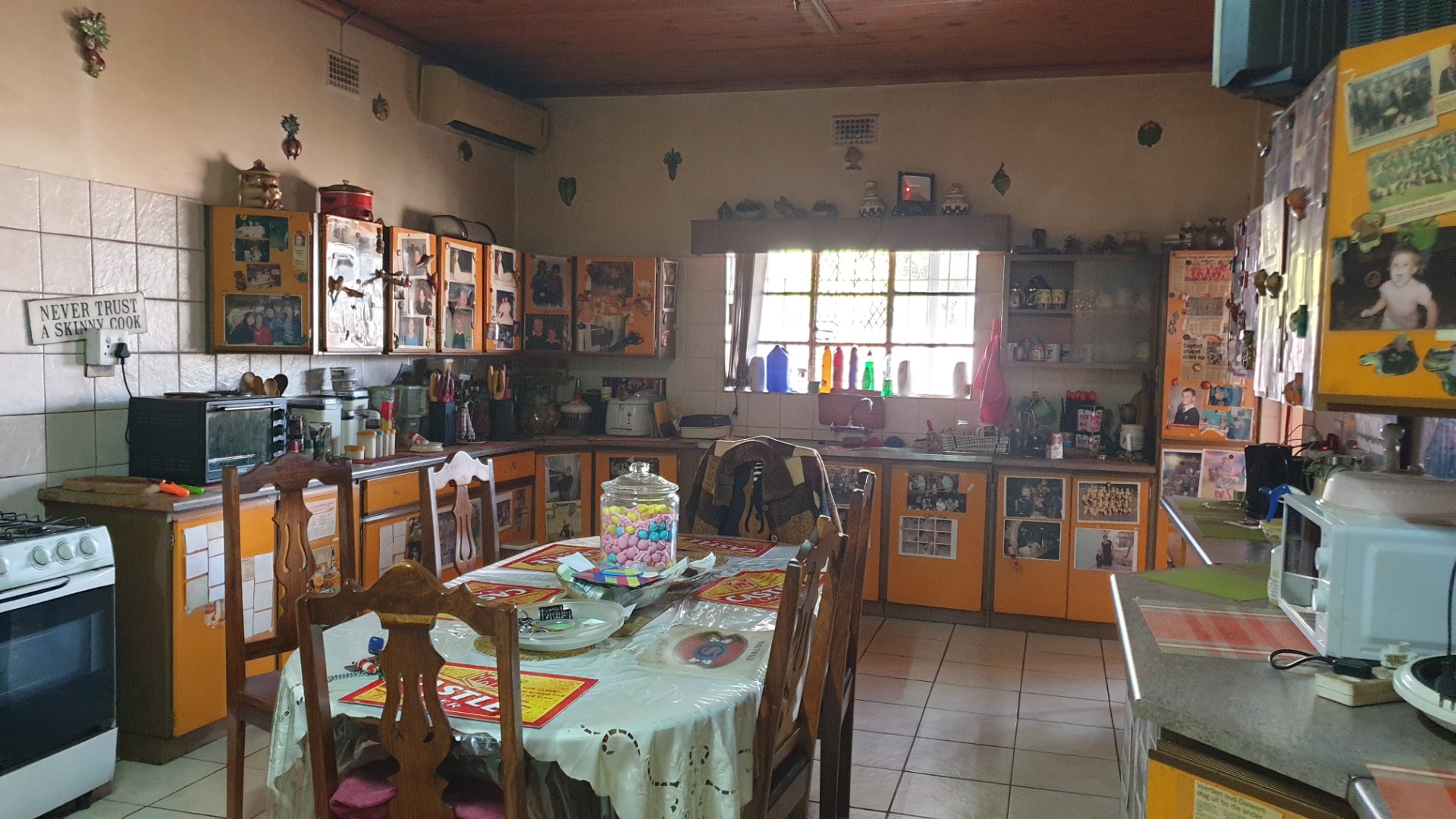 Large kitchen with gas stove an lots of cupboards .