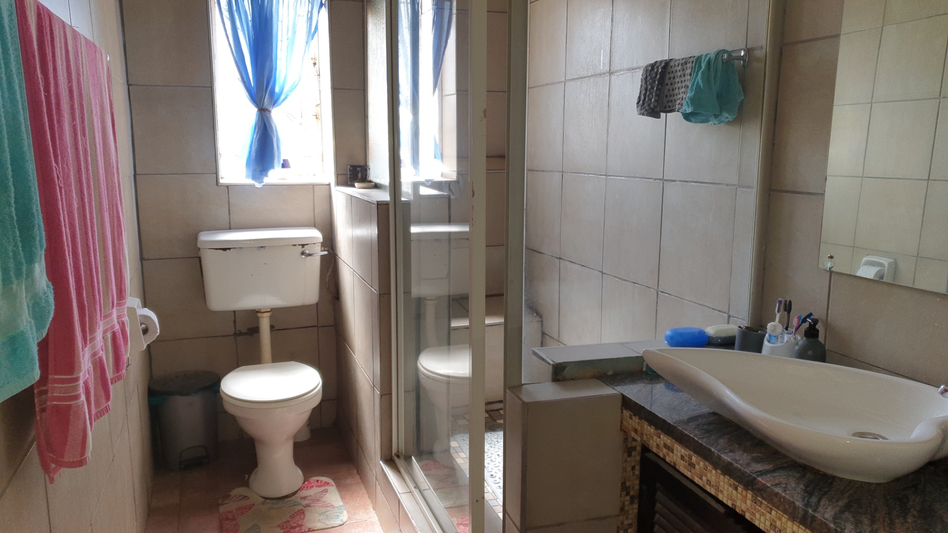 Tiled bathroom with shower , toilet and basin .