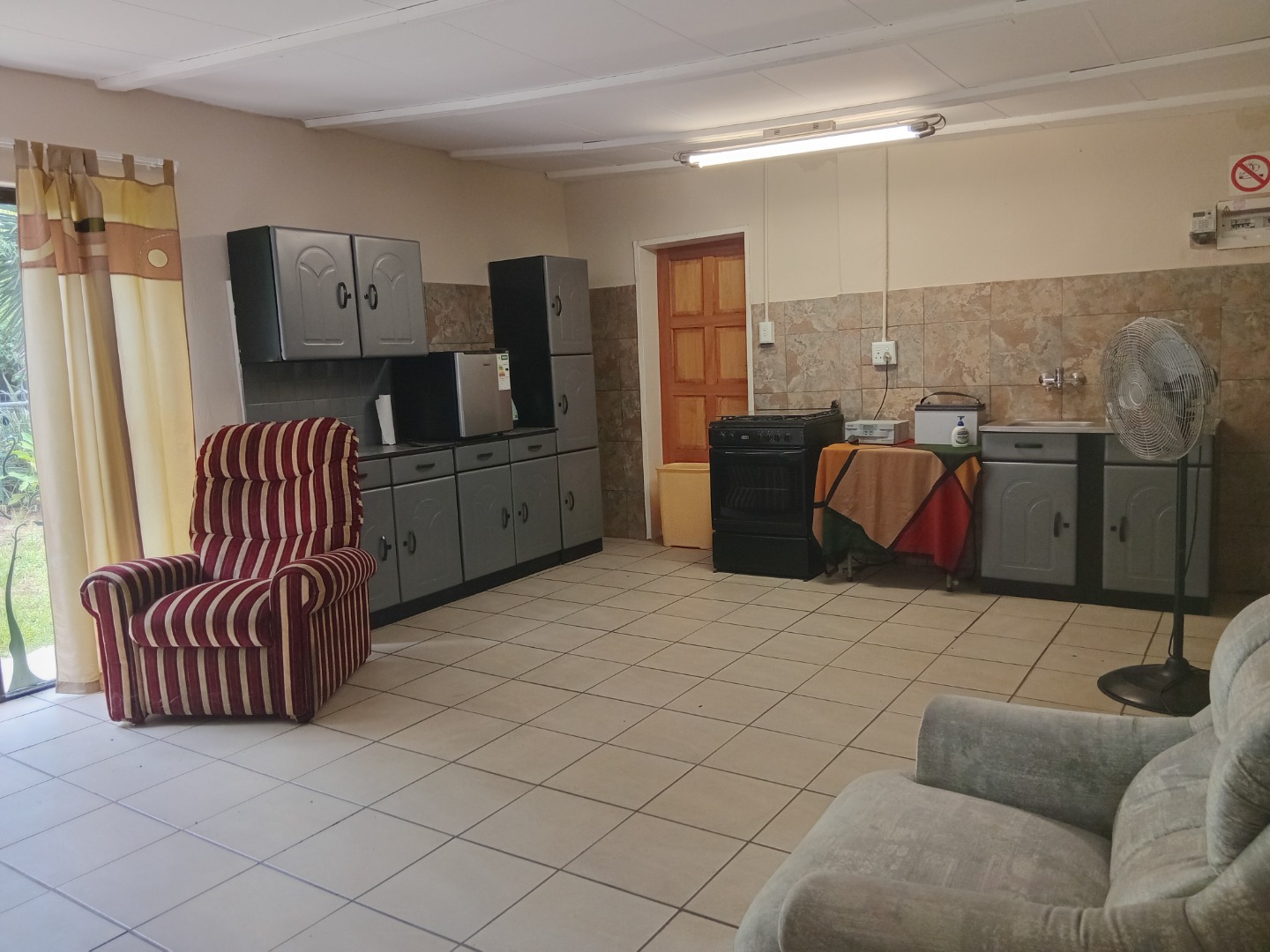 1 bedroom with bathroom and separate toilet, open plan lounge and kitchen, gas geyser, solar power and prepaid facility.
