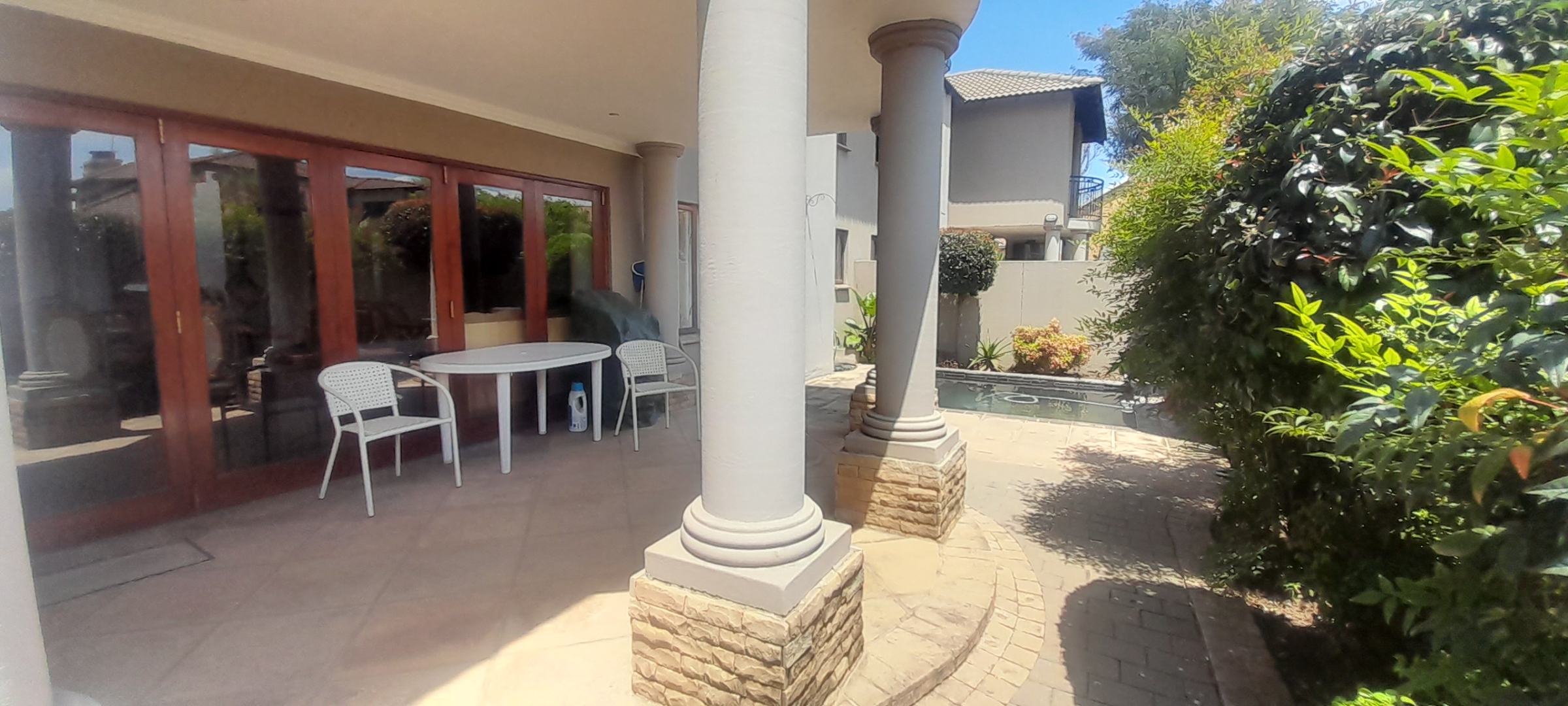 Beyond the interiors, a private oasis awaits. The lush, established garden, complete with paving, frames a sparkling swimming pool – ideal for leisurely afternoons. An expansive patio features a built-in braai, perfect for al fresco dining and entertaining. Nestled within a secure estate with 24-hour security and access control, this home offers unparalleled peace of mind. Fibre connectivity ensures seamless digital living.
