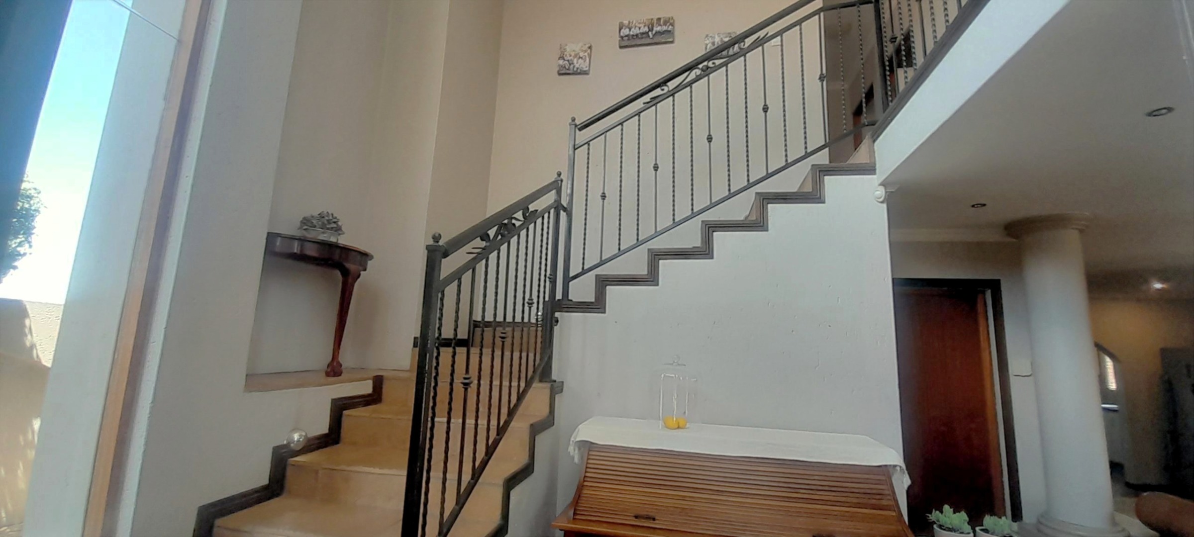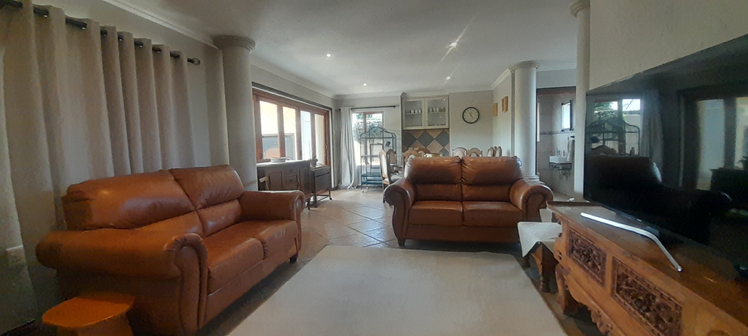 Commanding a distinguished presence within the esteemed Sonneveld estate in Brakpan, this magnificent residential offering epitomises sophisticated suburban living. The property immediately captivates with its architectural elegance, featuring a striking two-story design, multiple balconies, and a distinctive curved glass section that bathes the interiors in natural light. A modern wooden front door, flanked by elegant columns and a paved driveway, sets an inviting tone.