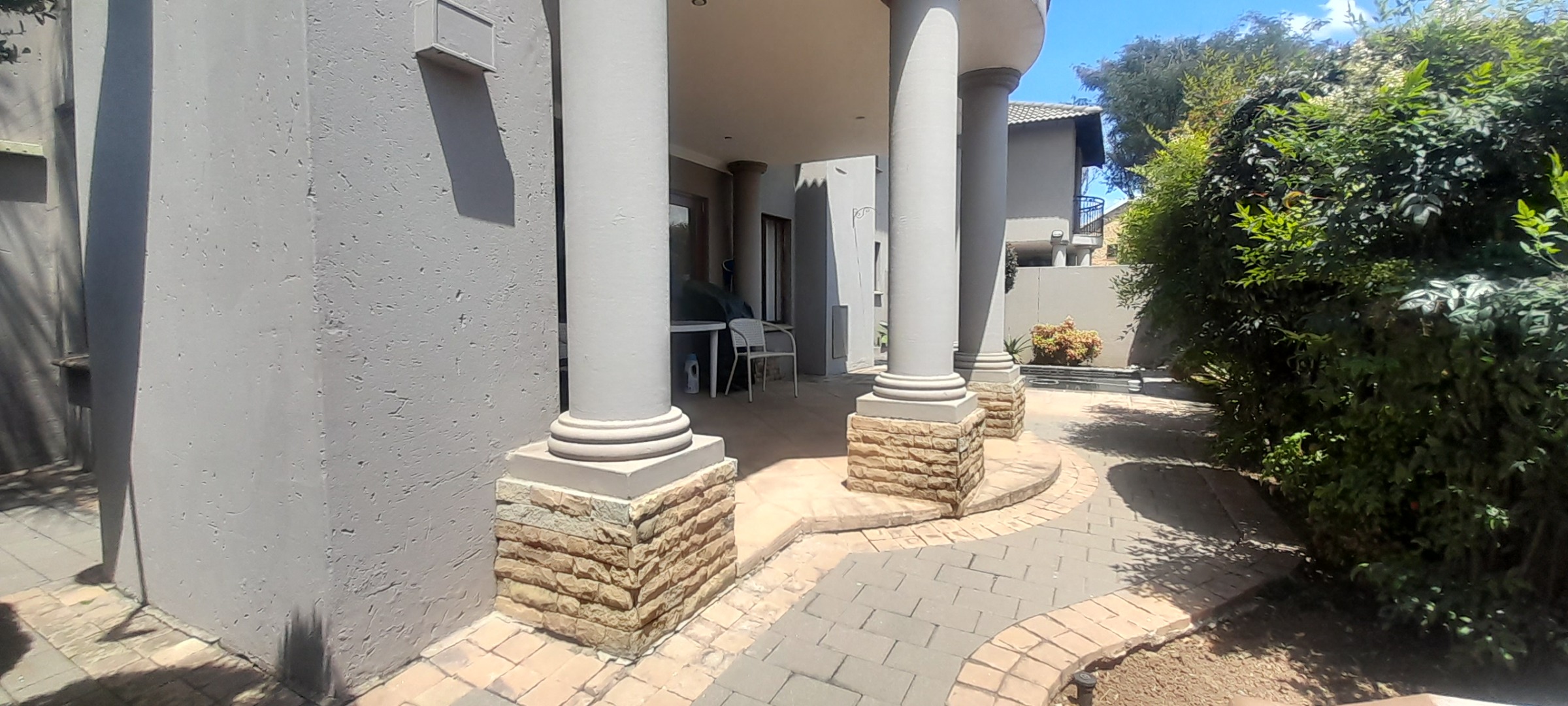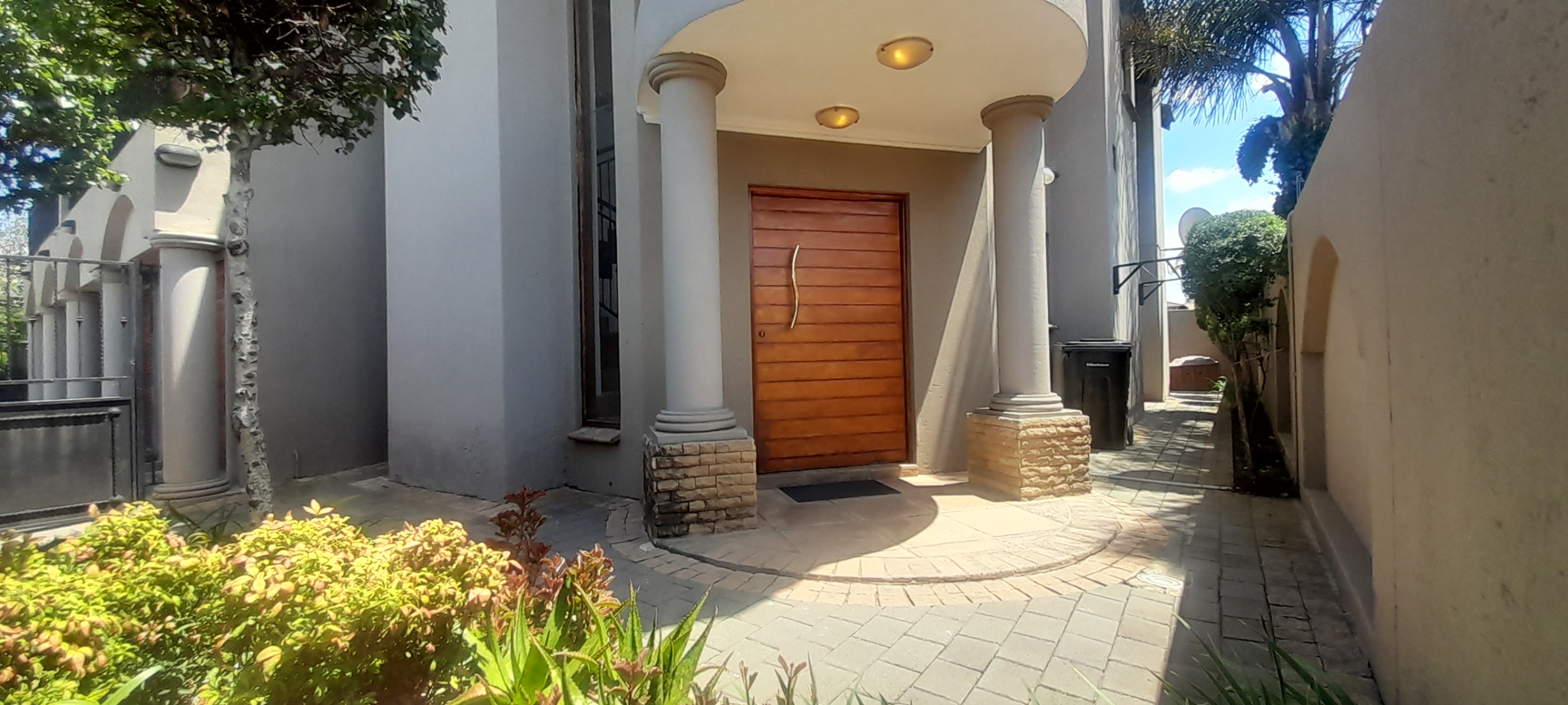 Commanding a distinguished presence within the esteemed Sonneveld estate in Brakpan, this magnificent residential offering epitomises sophisticated suburban living. The property immediately captivates with its architectural elegance, featuring a striking two-story design, multiple balconies, and a distinctive curved glass section that bathes the interiors in natural light. A modern wooden front door, flanked by elegant columns and a paved driveway, sets an inviting tone.